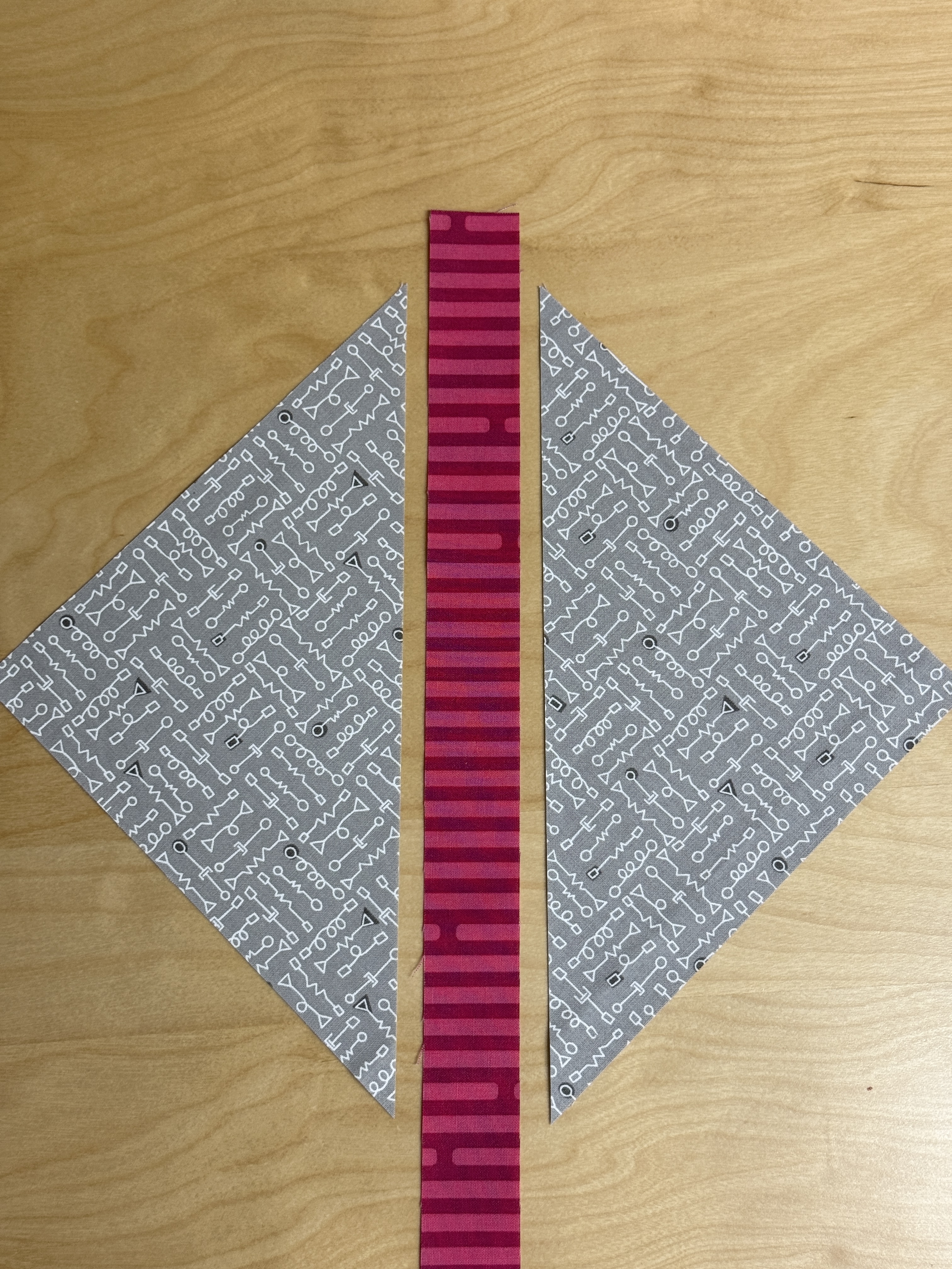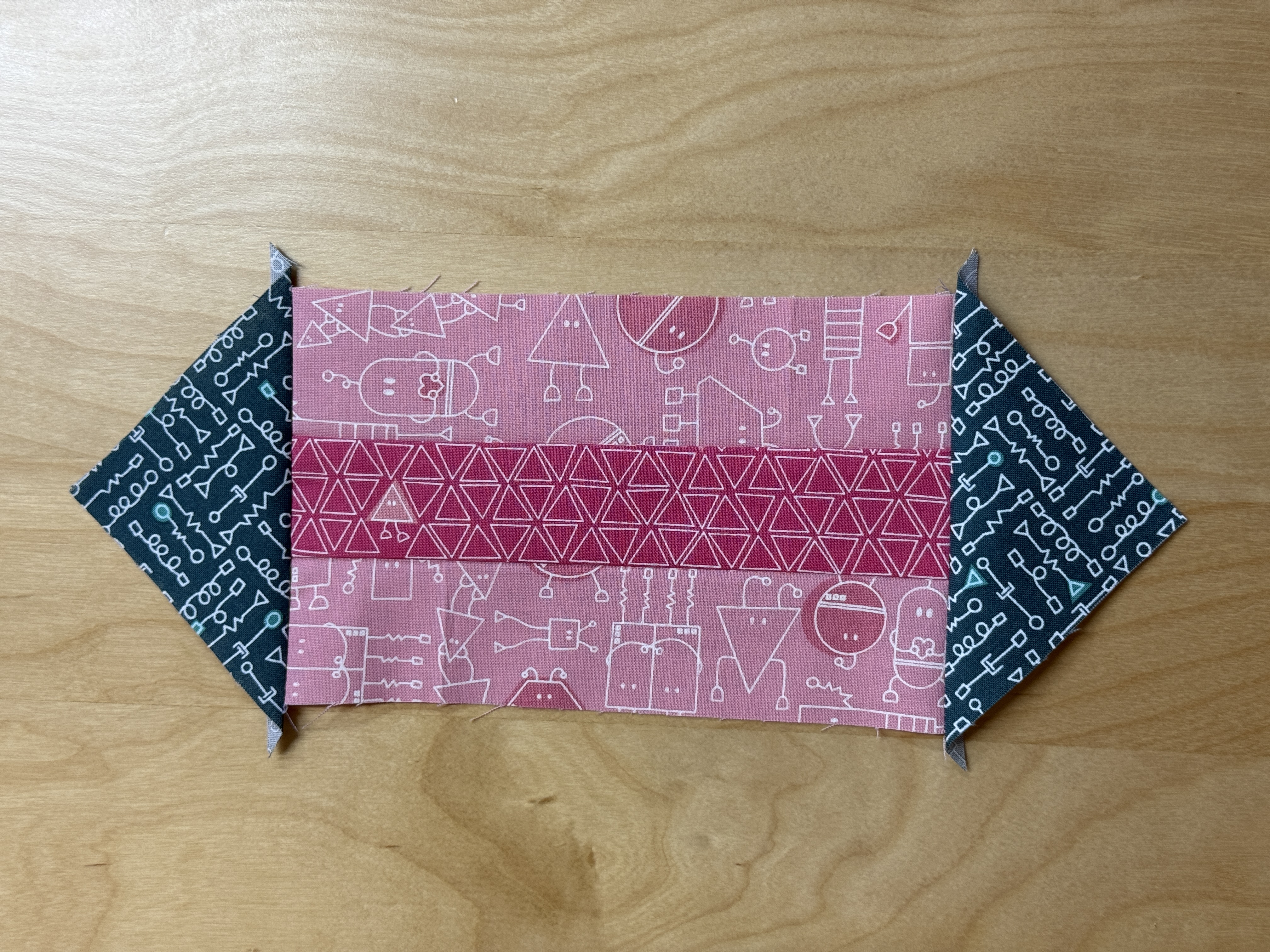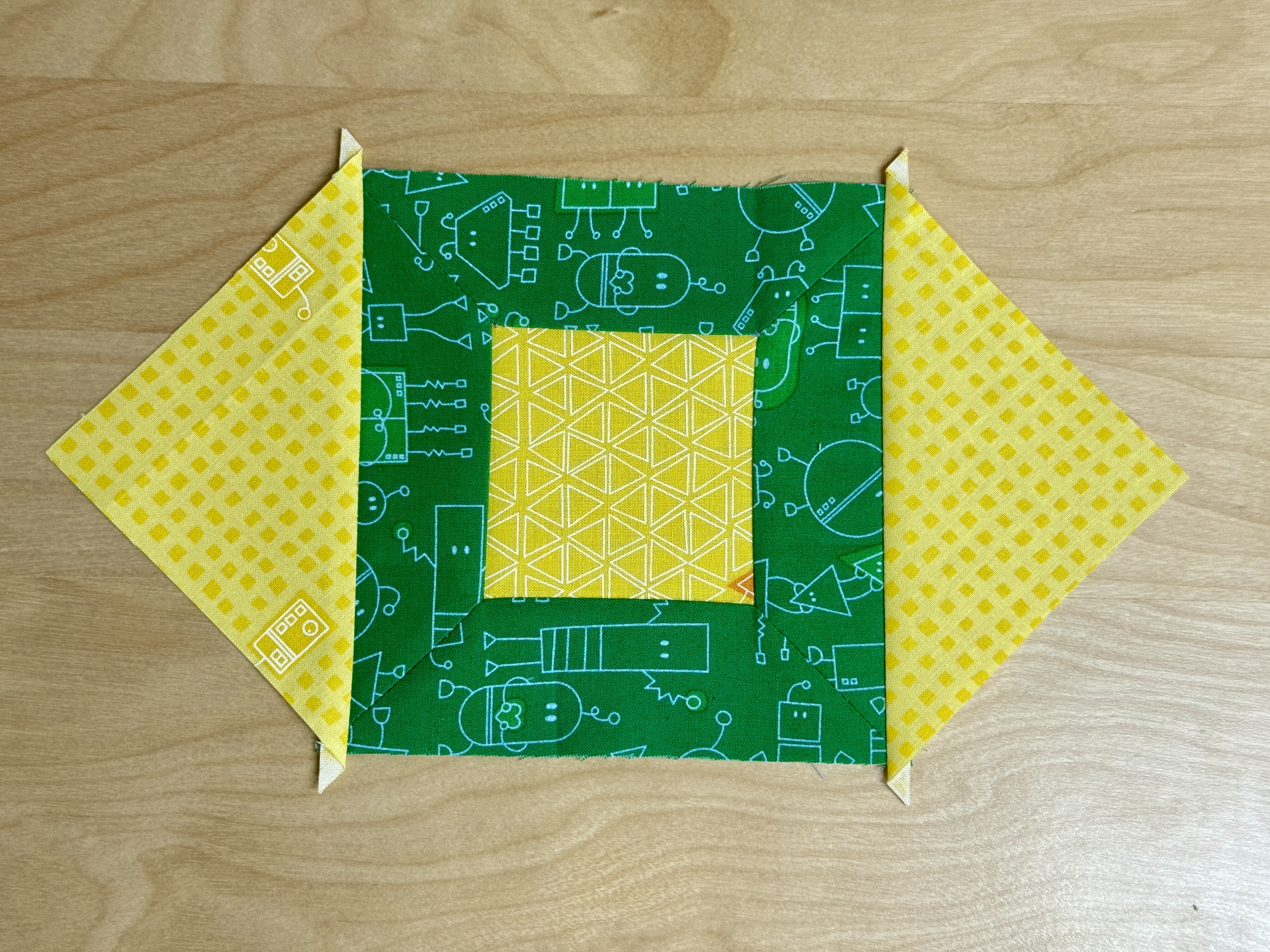 Nähen Sie die großen Dreiecke rechts und links an und bügeln Sie wieder. Ihr Block hat nun eine Größe von 8,5“.