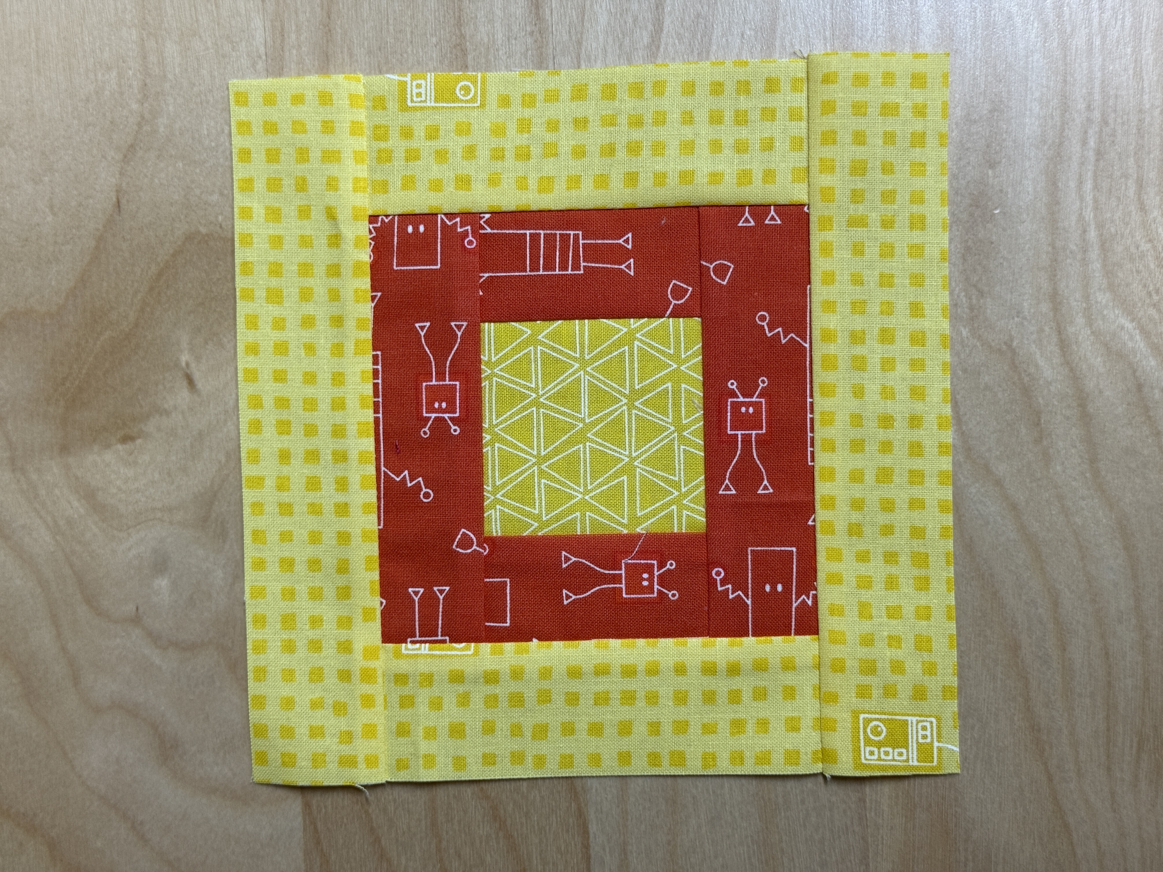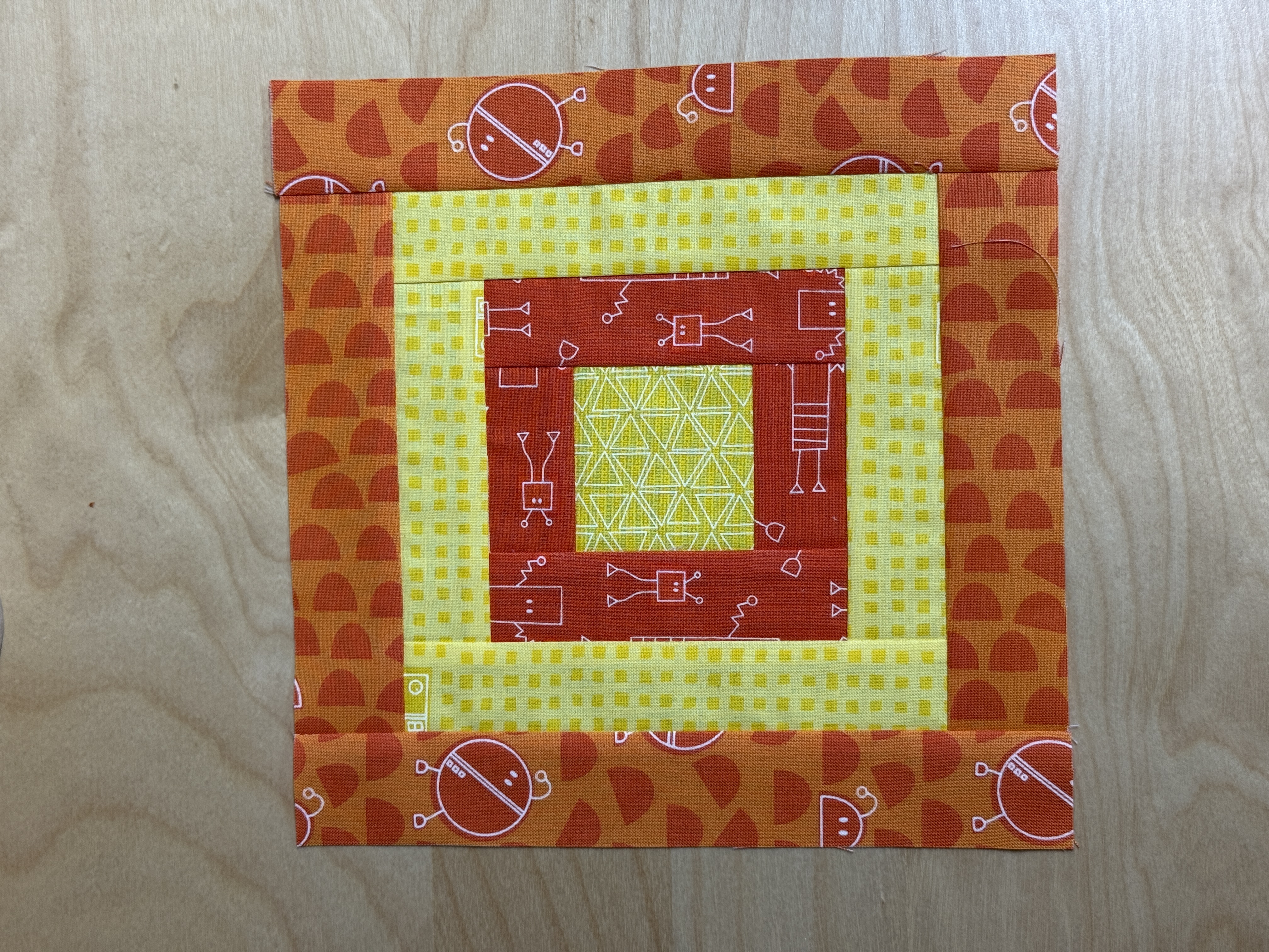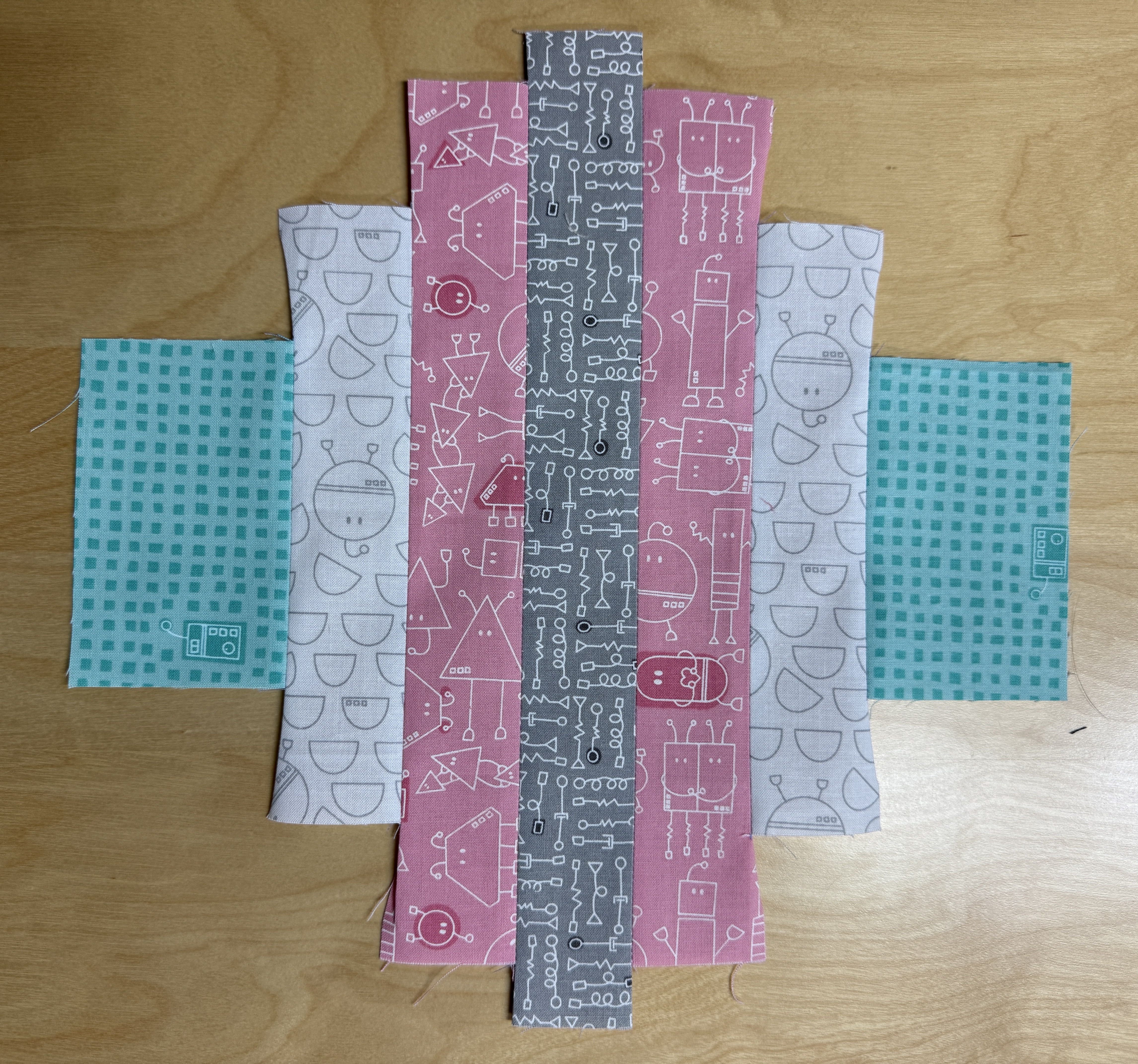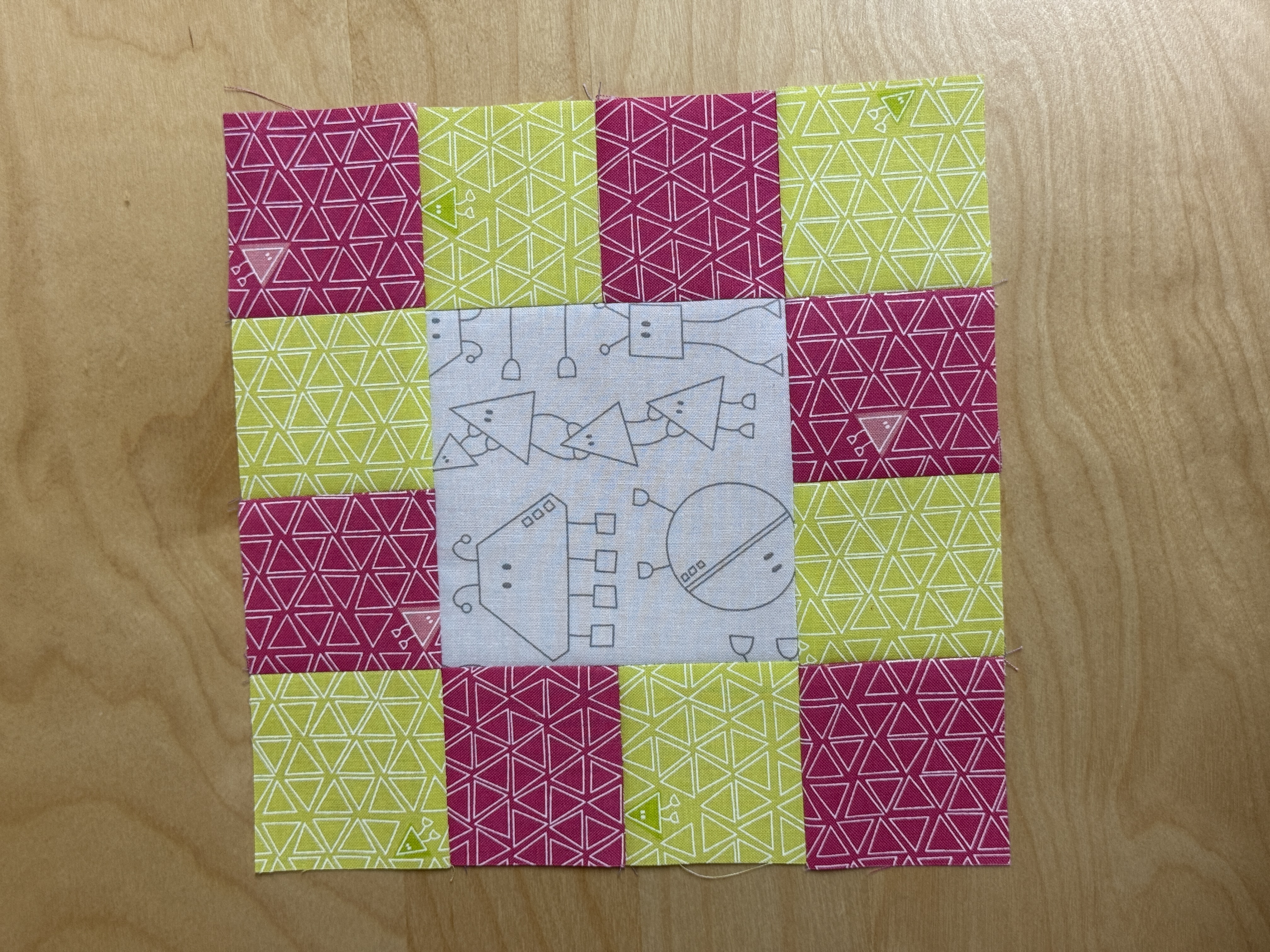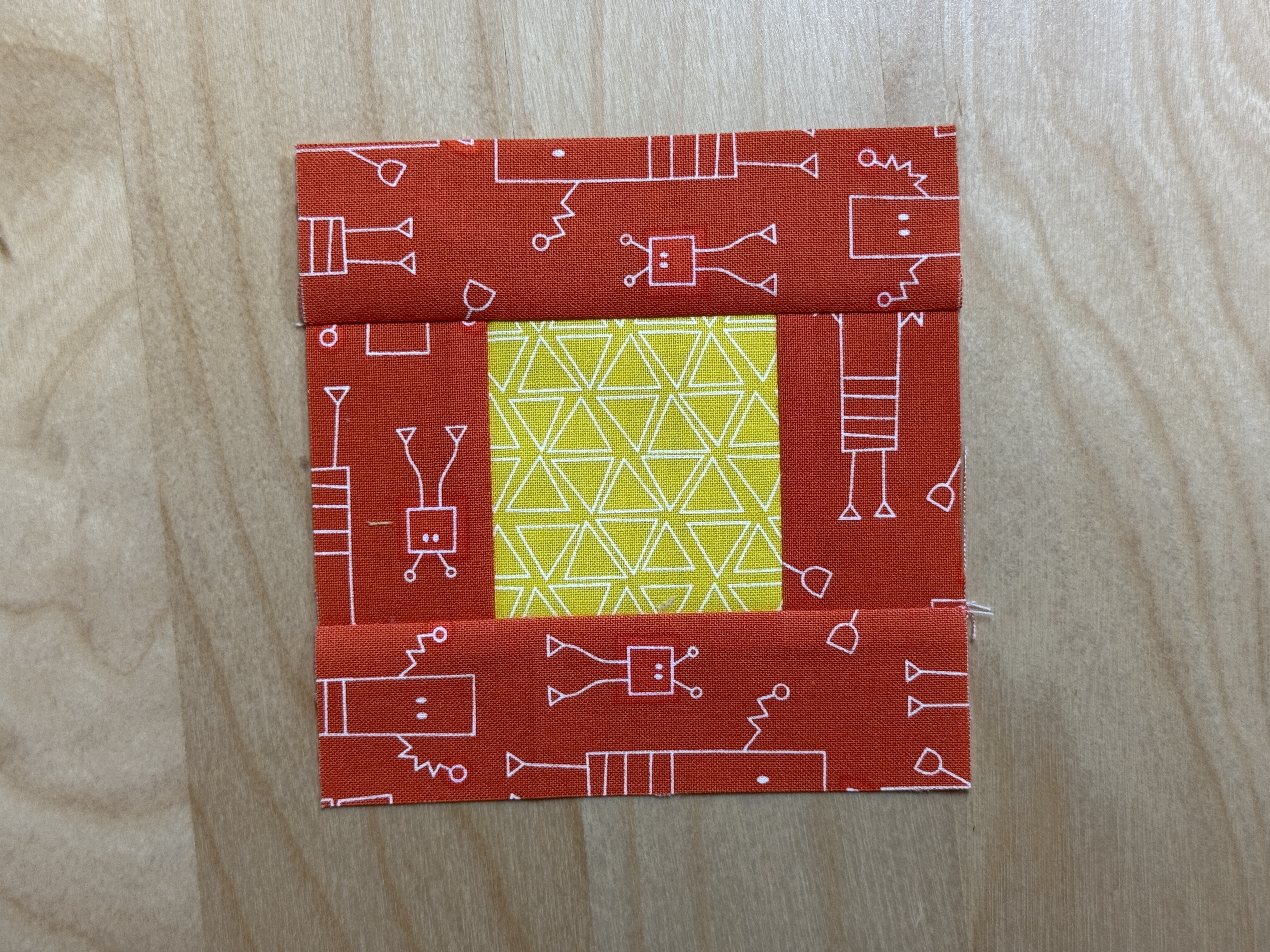 Schneiden Sie ein Quadrat mit 2,5" zu, 2 Stücke mit 1,5" x 2,5" sowie 2 Stücke mit 1,5" x 4,5". Nähen sie die Streifen um das Quadrat und bügeln Sie die Nähte um.