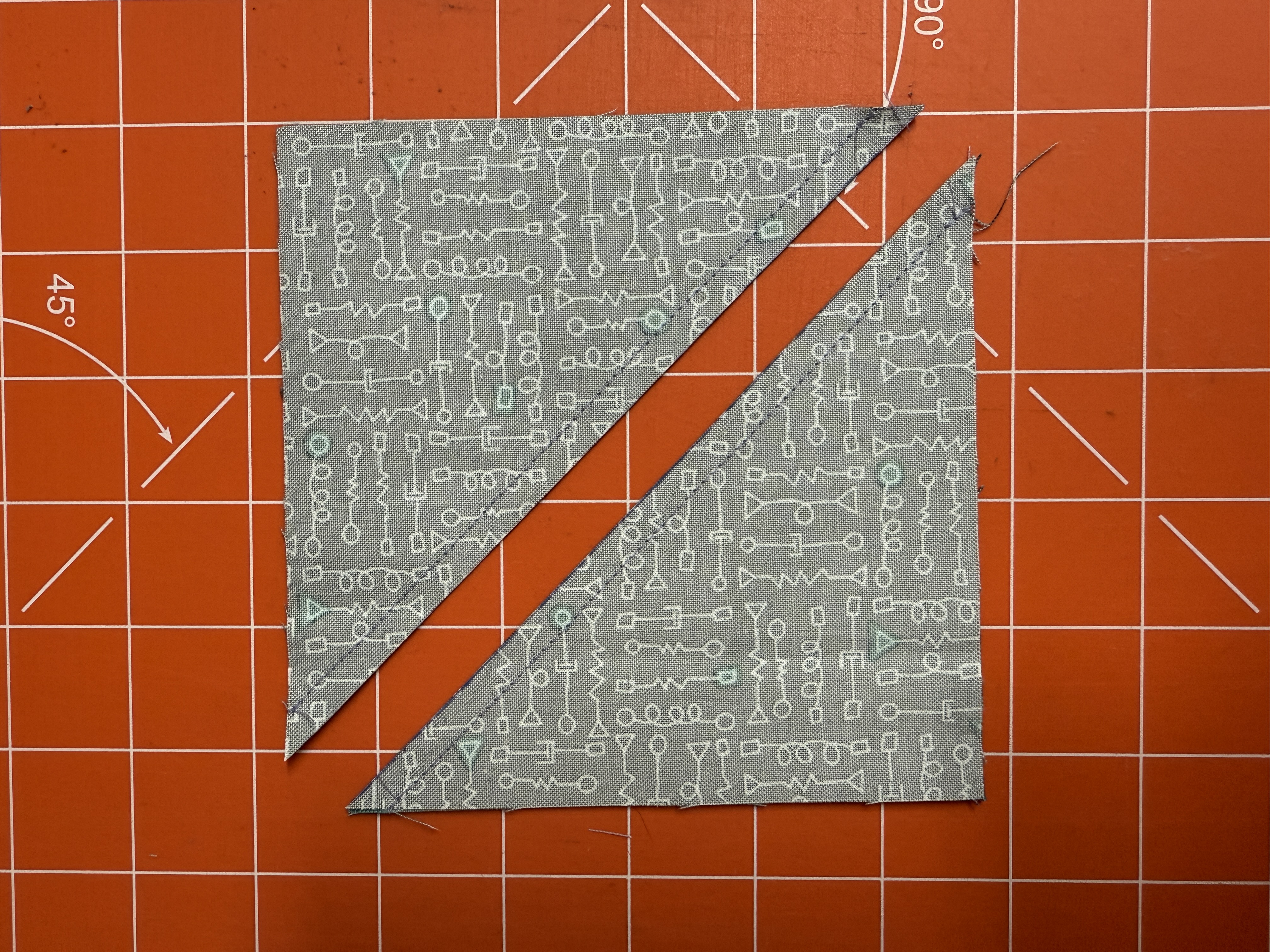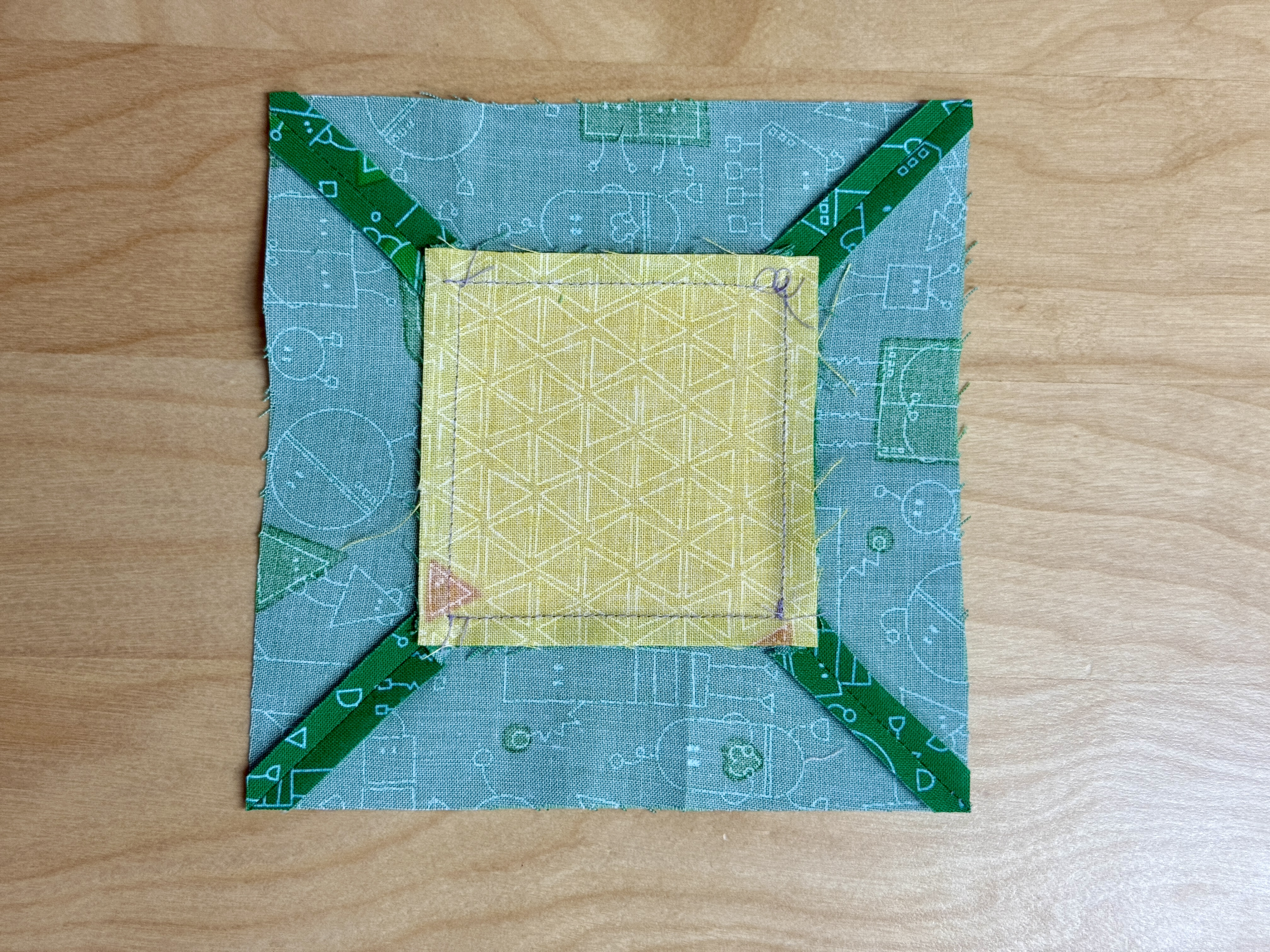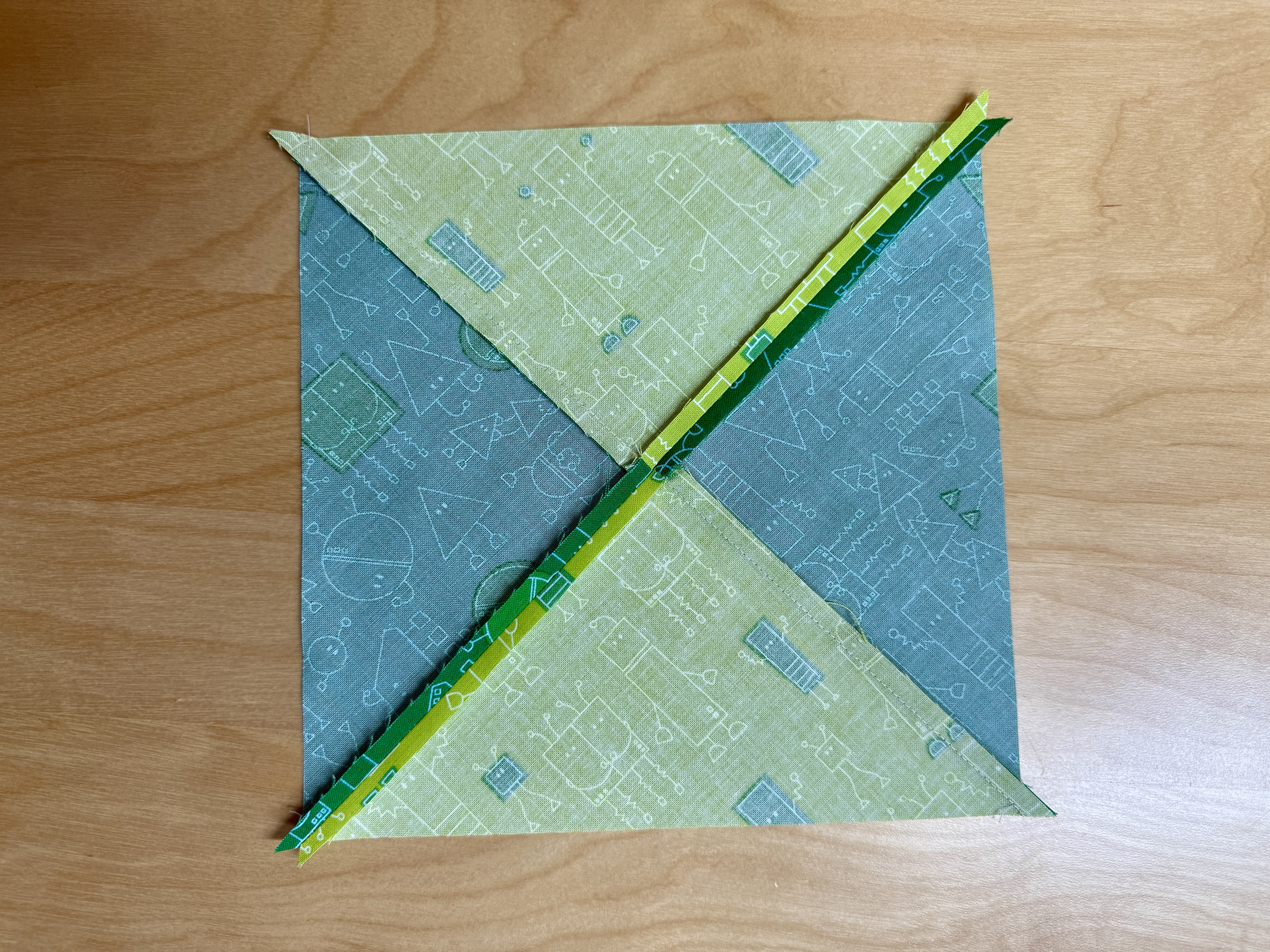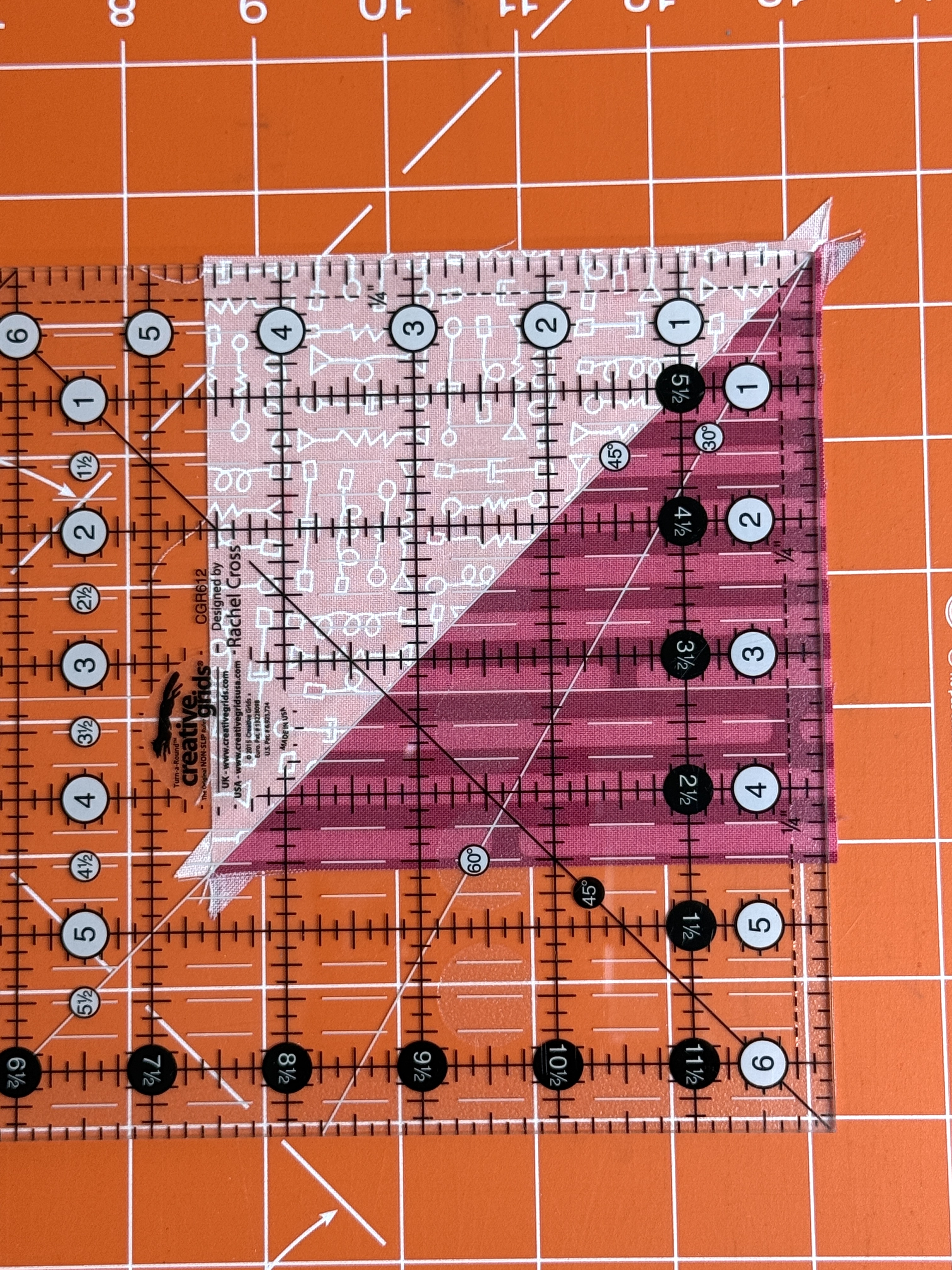 Nähen Sie die Dreiecke zusammen und bügeln Sie alles gut. Trimmen Sie dann das Quadrat auf 4,5".