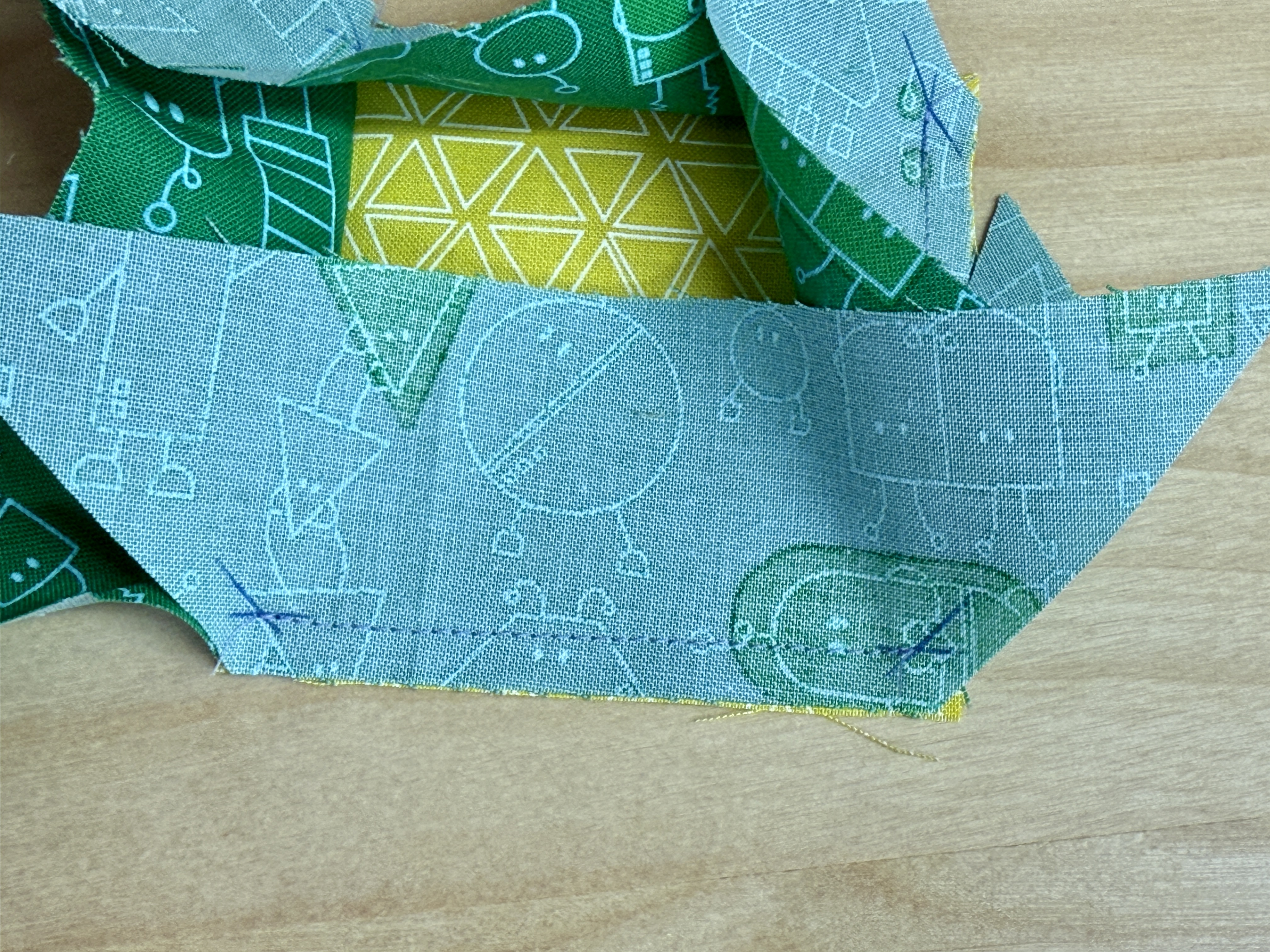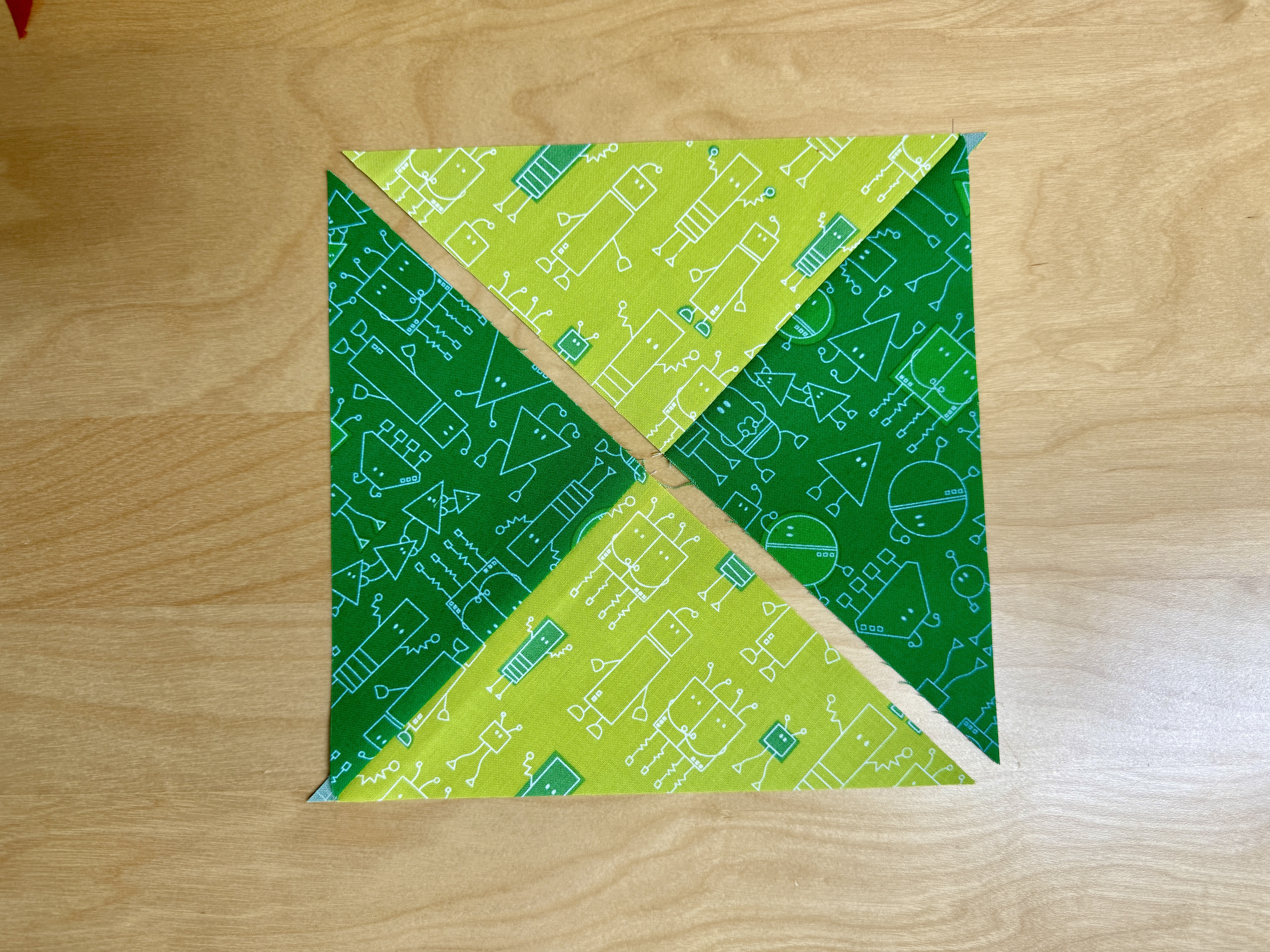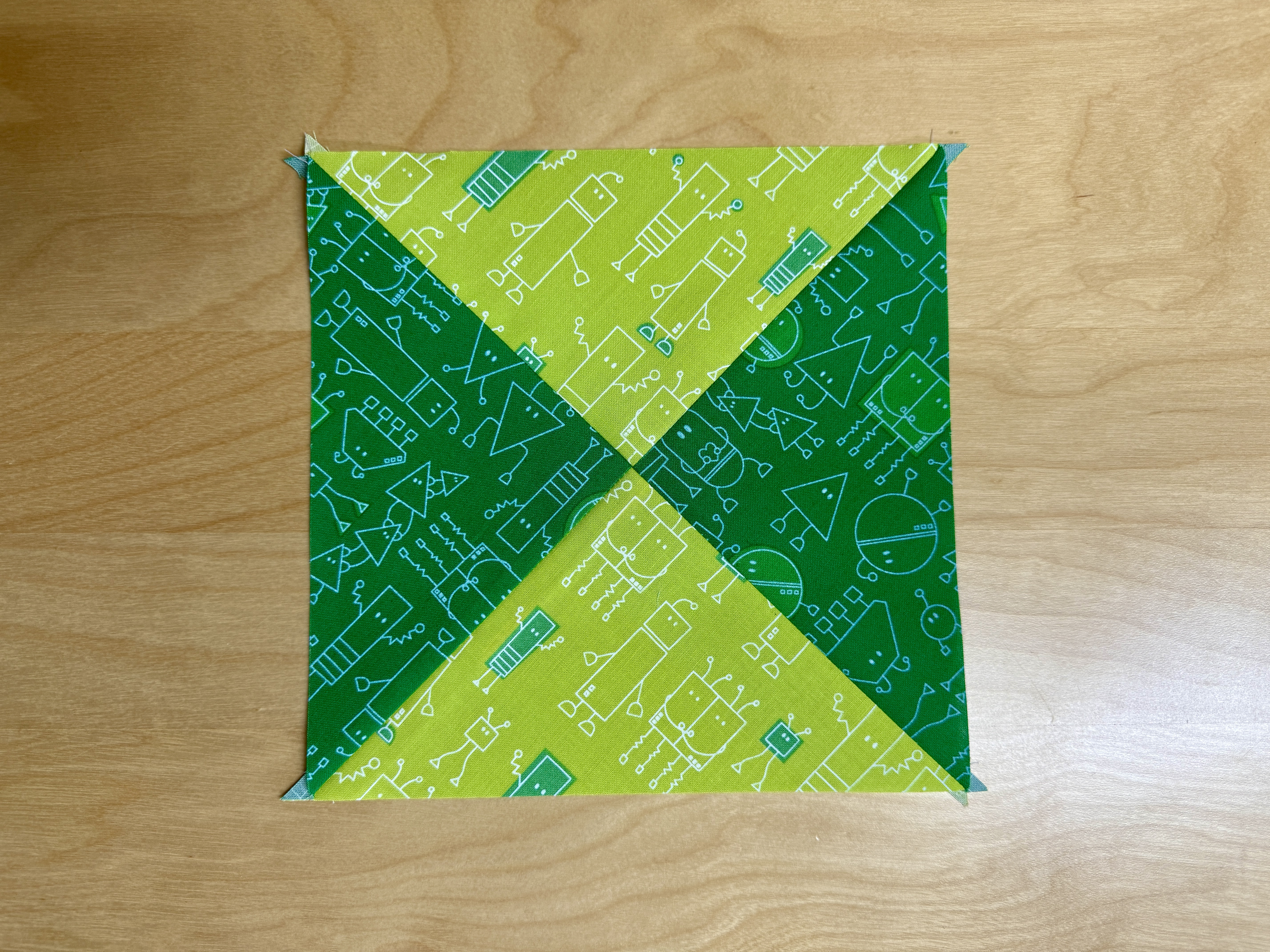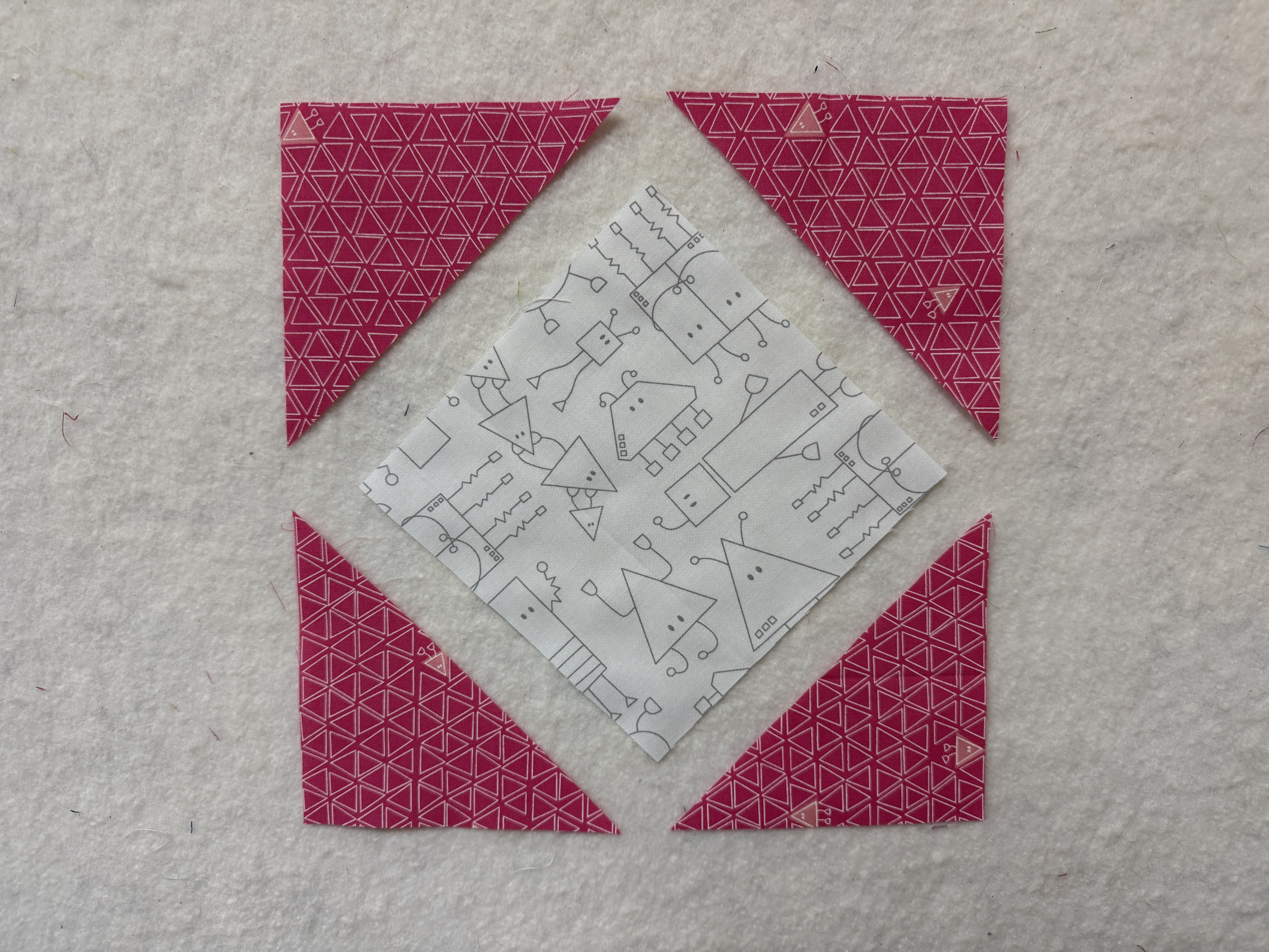 Nähen Sie die Dreiecke zusammen und bügeln Sie alles gut. Trimmen Sie dann das Quadrat auf 4,5".