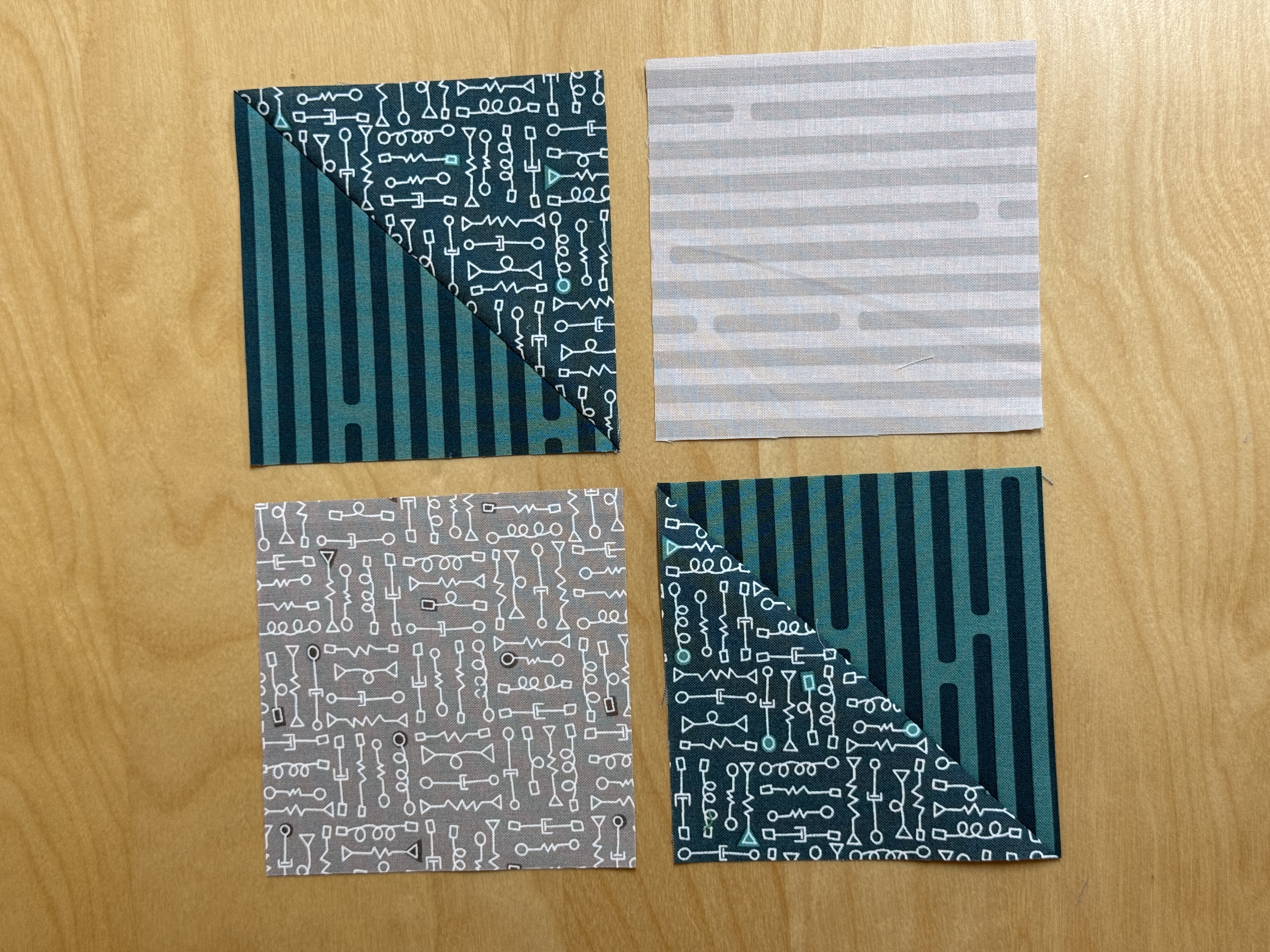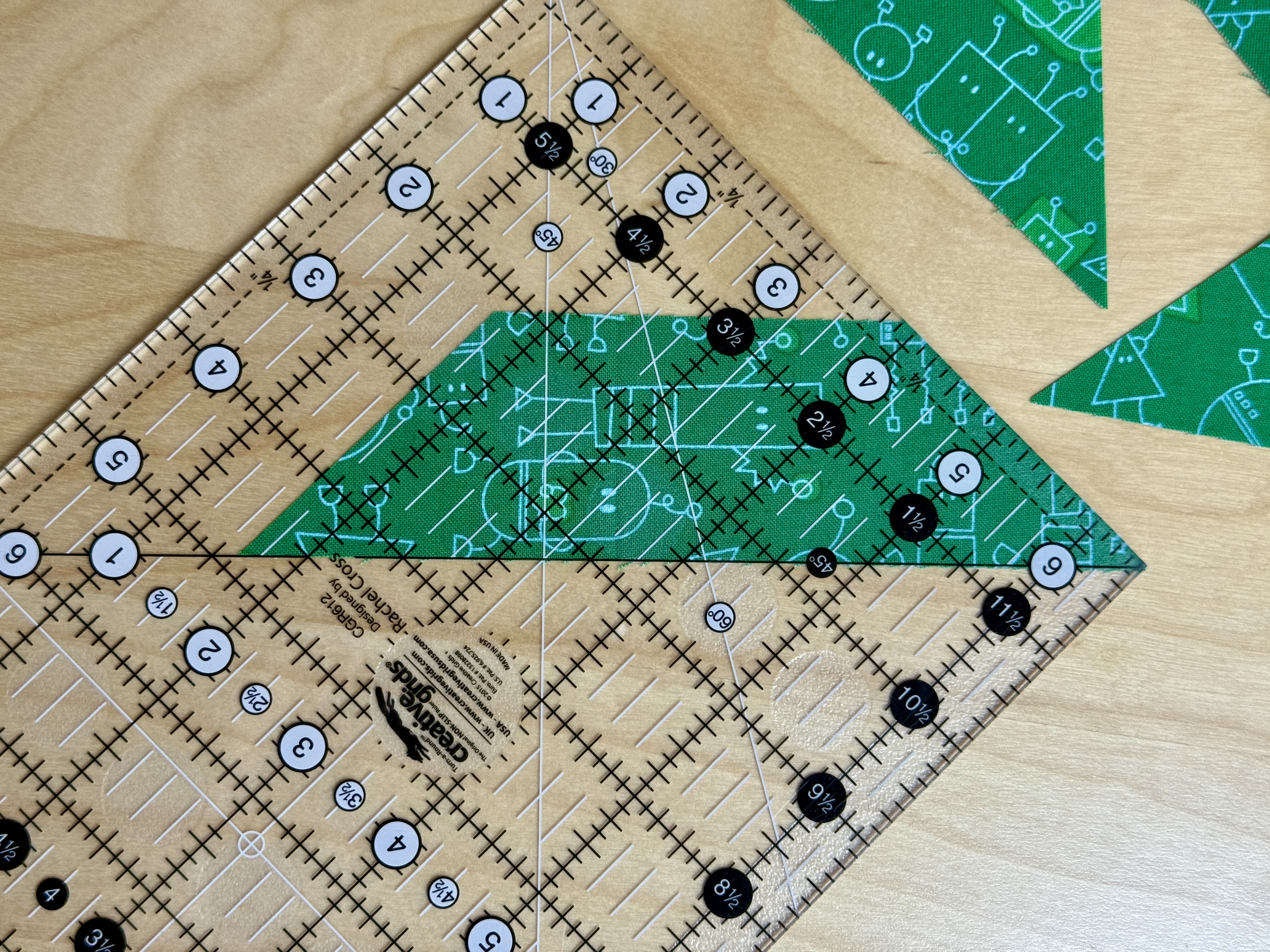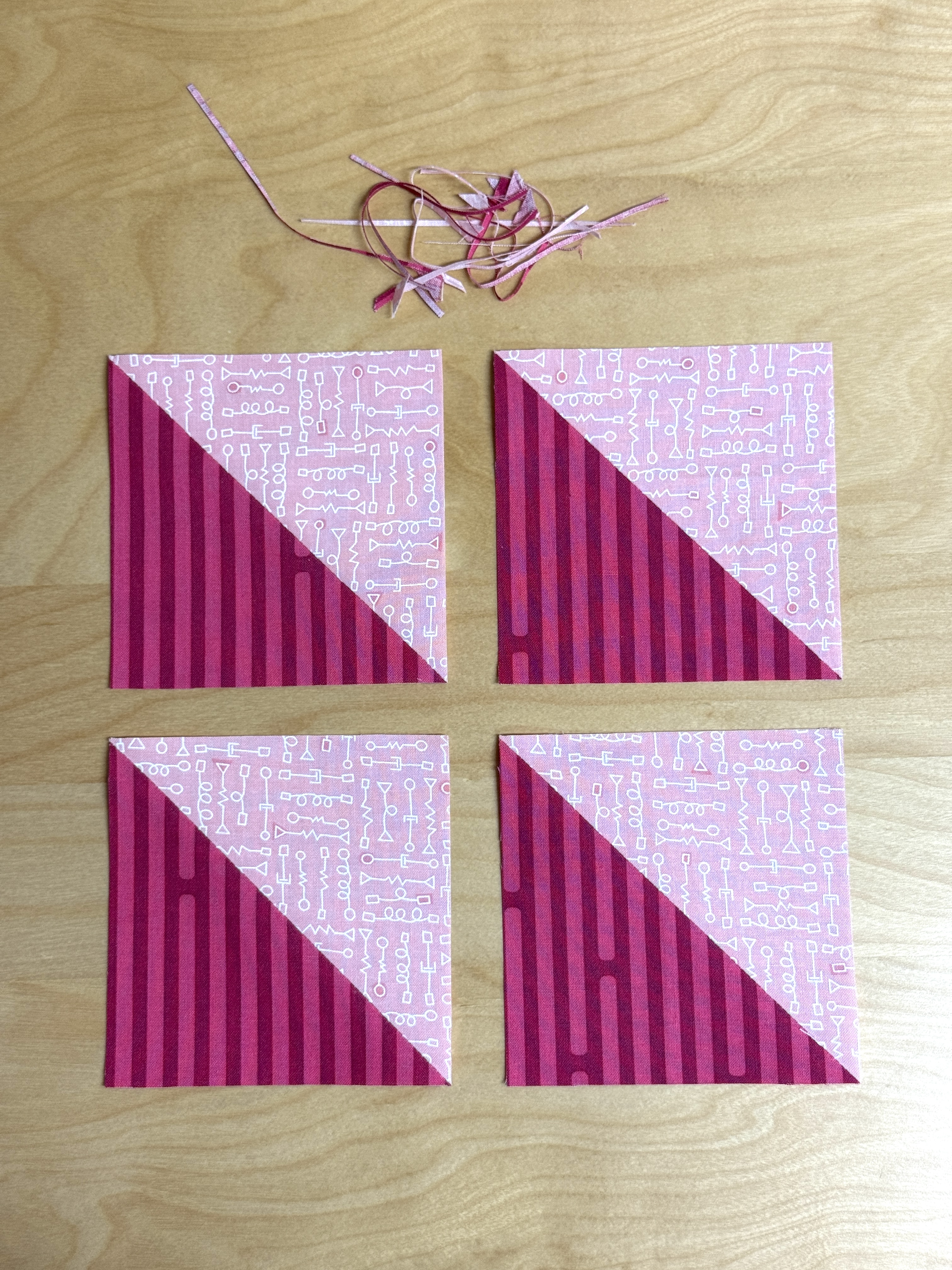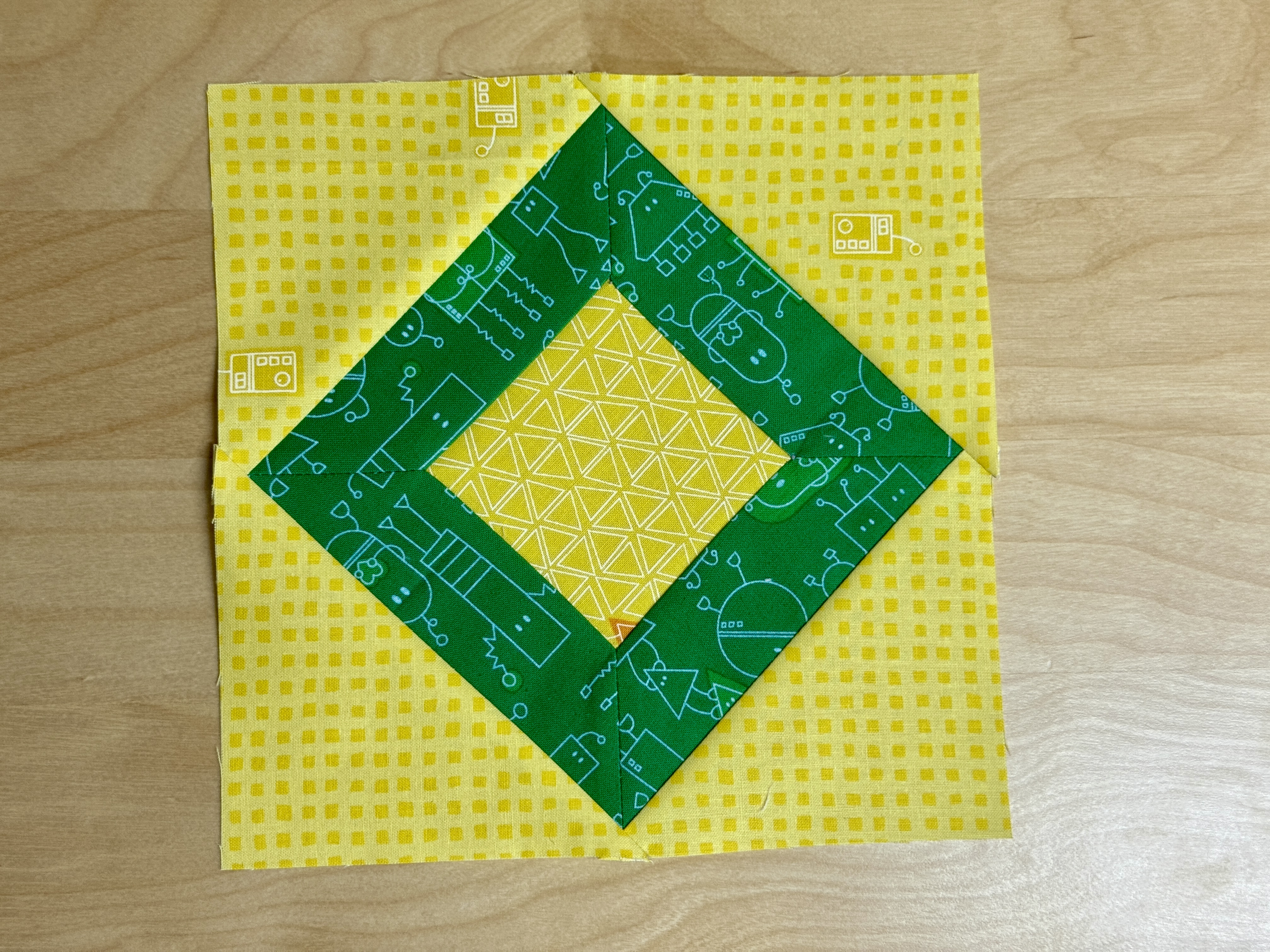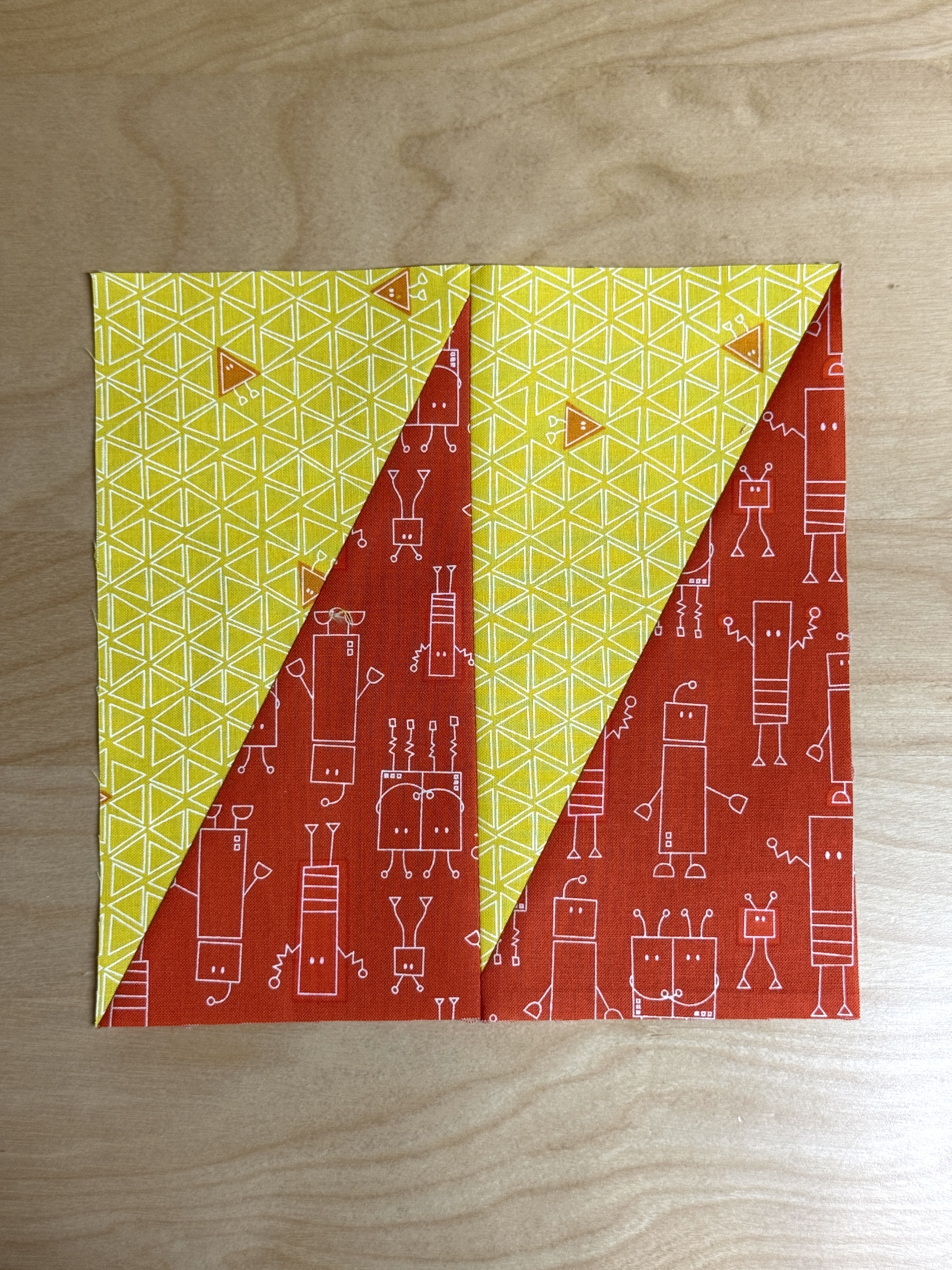 Nähen Sie die Dreiecke zusammen und bügeln Sie alles gut. Trimmen Sie dann das Quadrat auf 4,5".