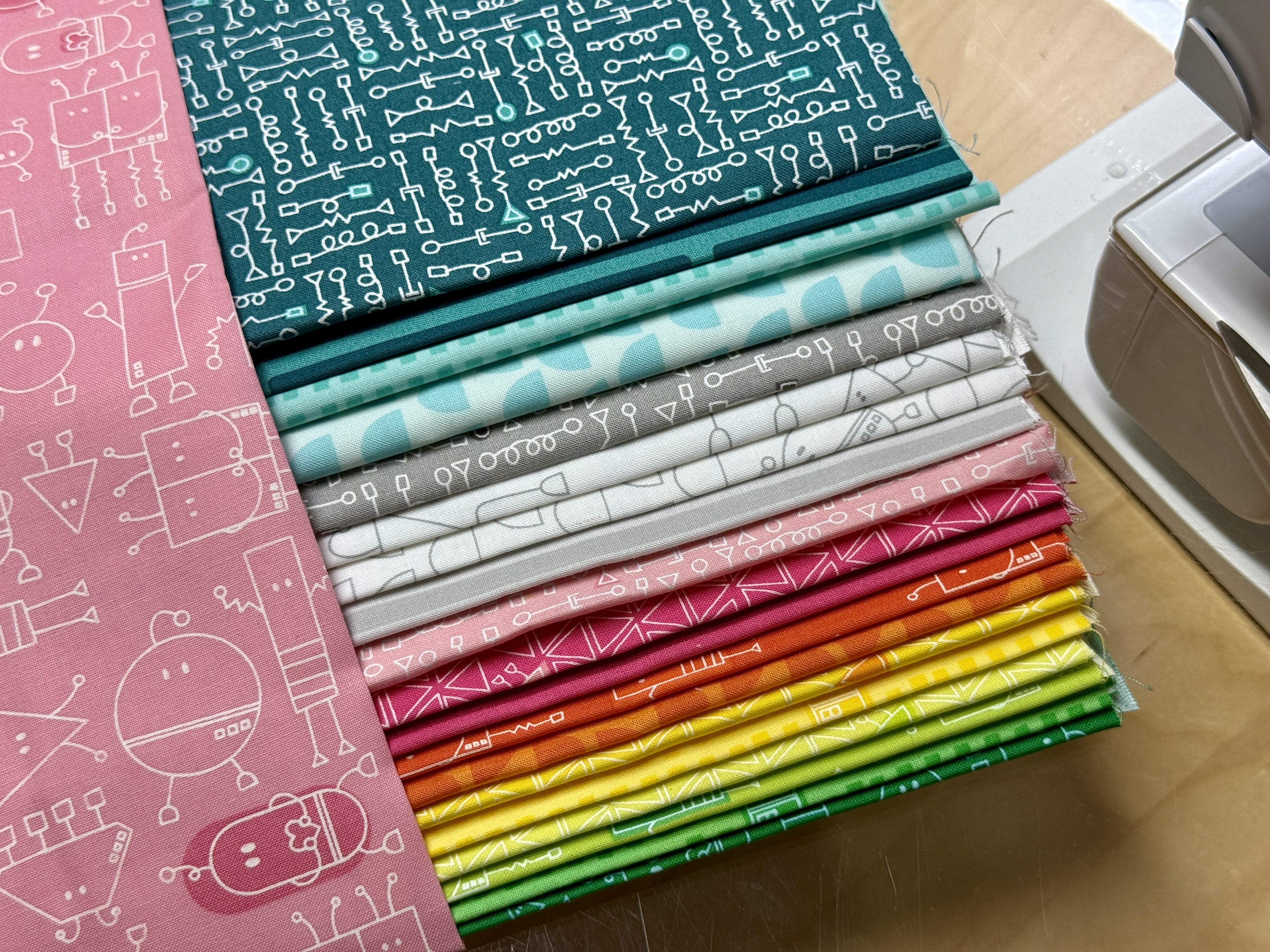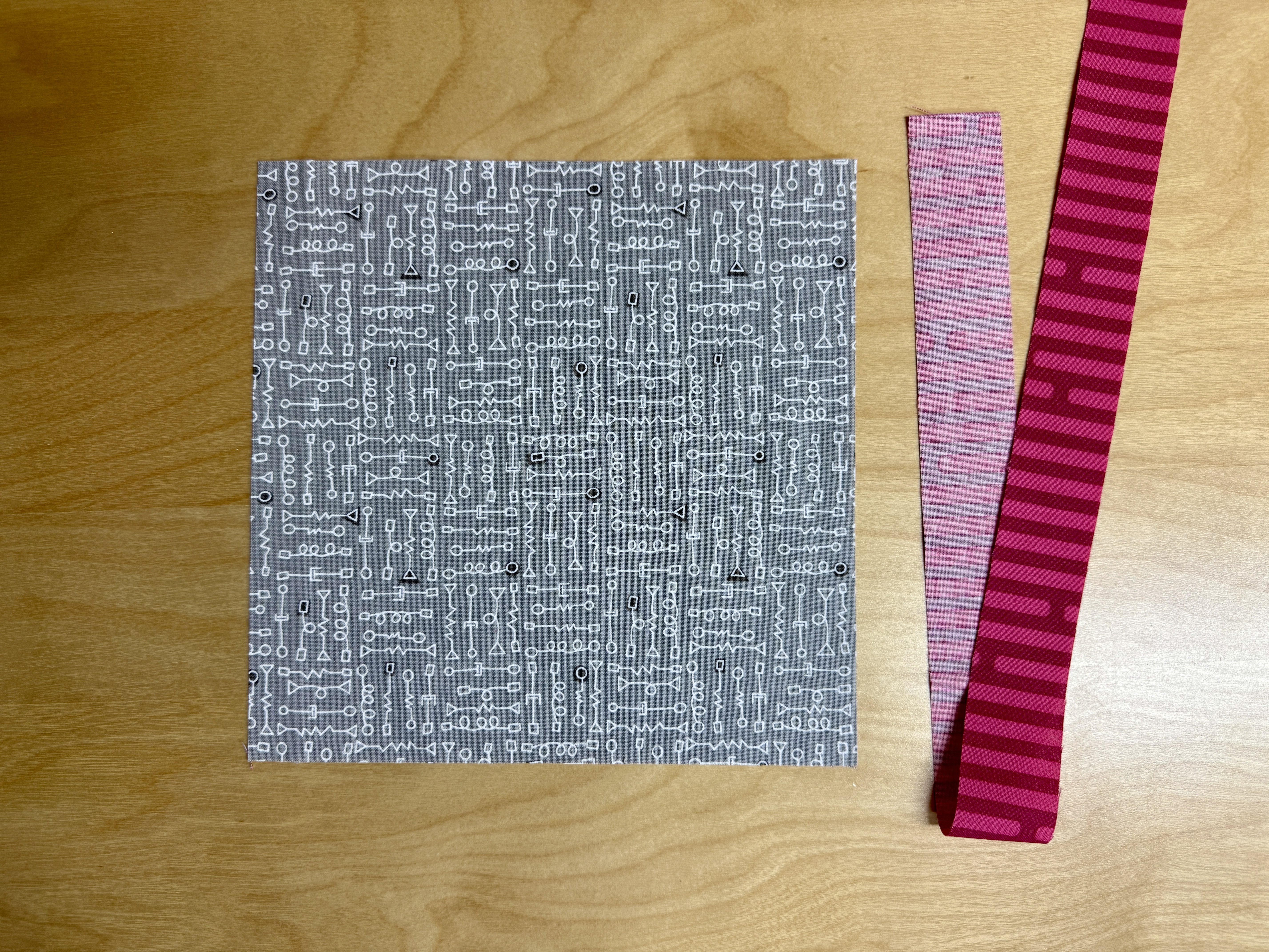 Schneiden Sie 1 Quadrat mit 2,5", 2 Streifen mit 2,5" x 10,5" (wobei hier ein Streifen der gleiche Stoff wie das Quadrat sein muss) und schneiden Sie 2 Streifen 1,5 x 6,5" und 2 Streifen mit 1,5" x 8,5" zu. (Abgebildet von links nach rechts und alles inkl. Nahtzugabe.)