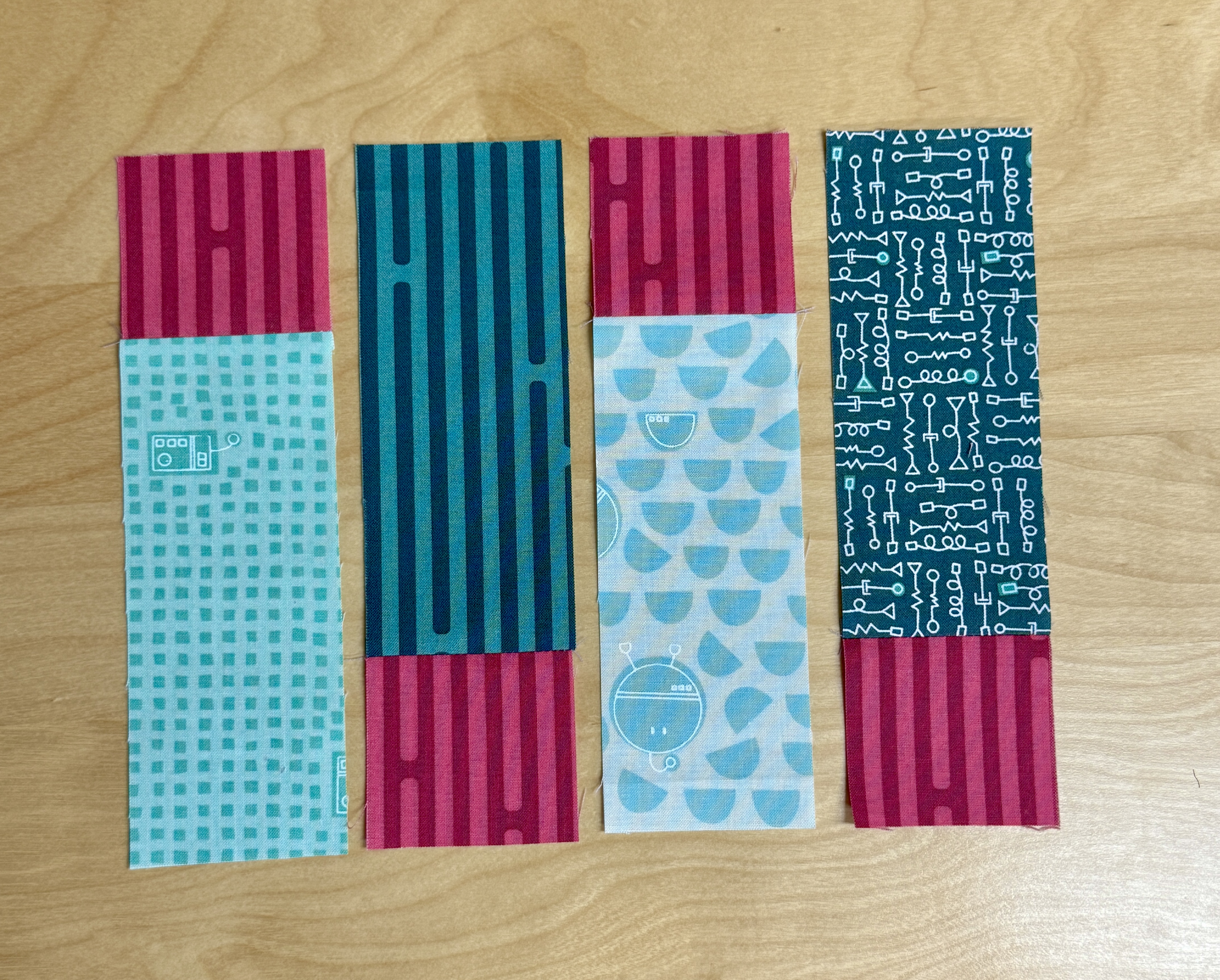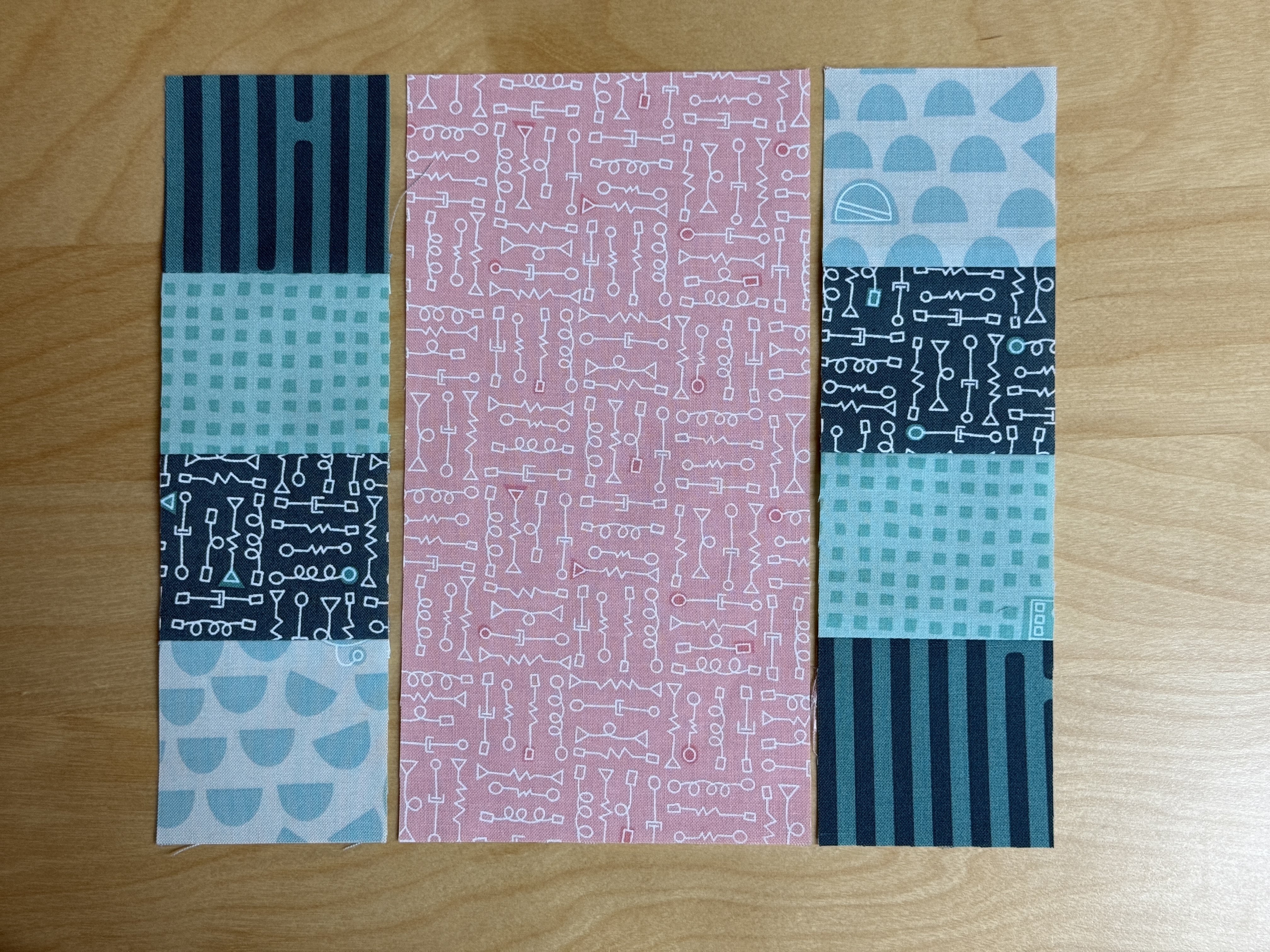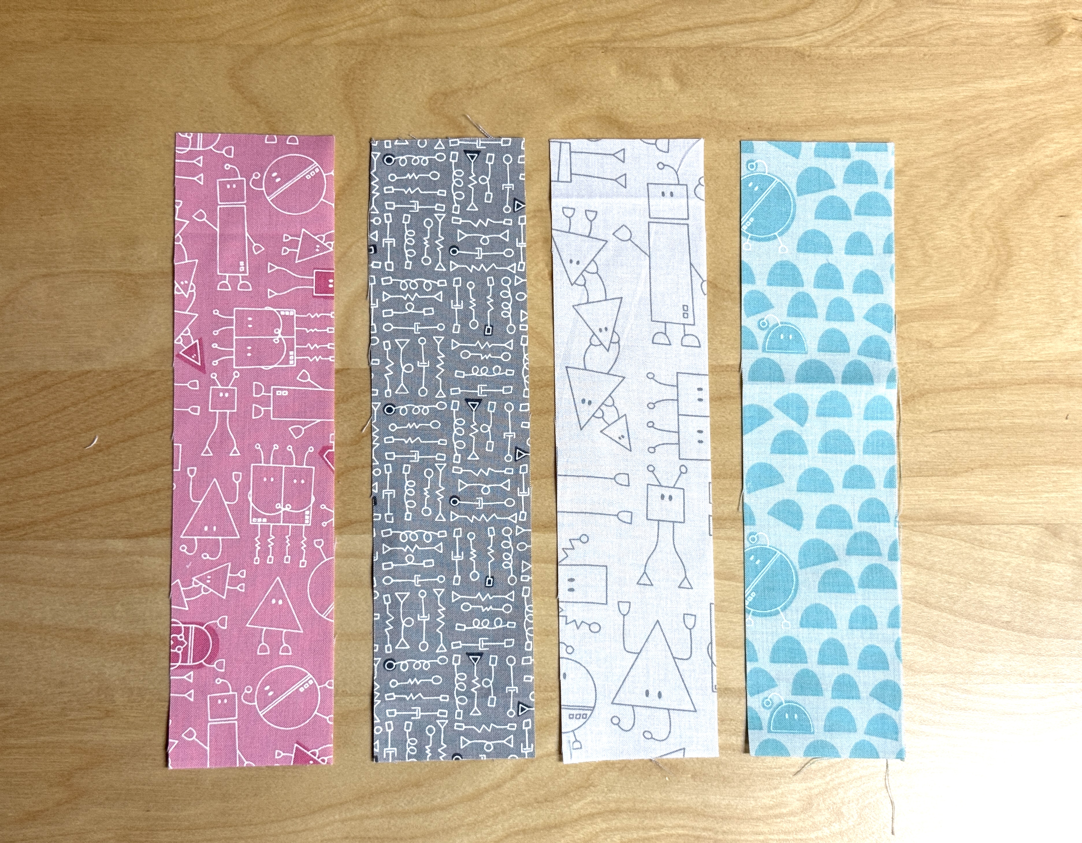 Schneiden Sie 4 Streifen zu je 2,5“ x 8,5“ zu. Nähen Sie diese zusammen und bügeln Sie die Nähte gut auseinander.