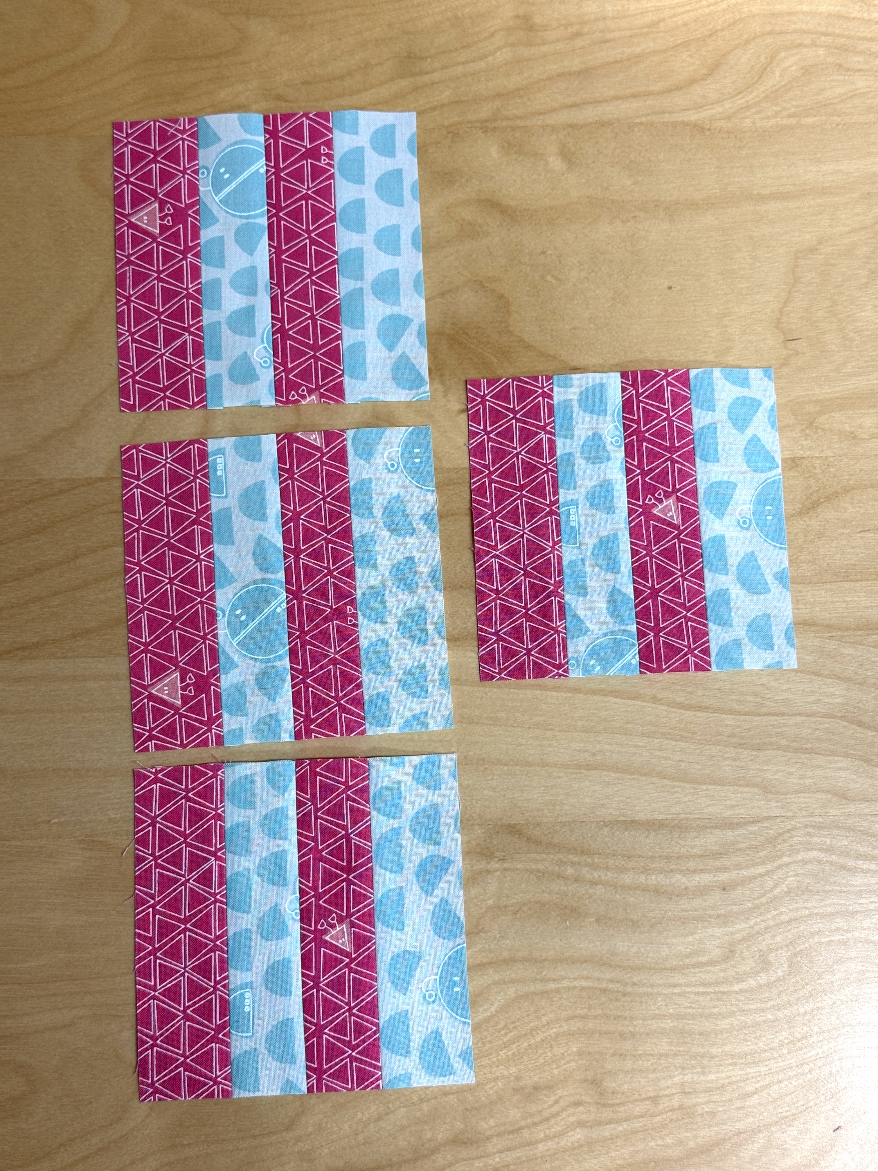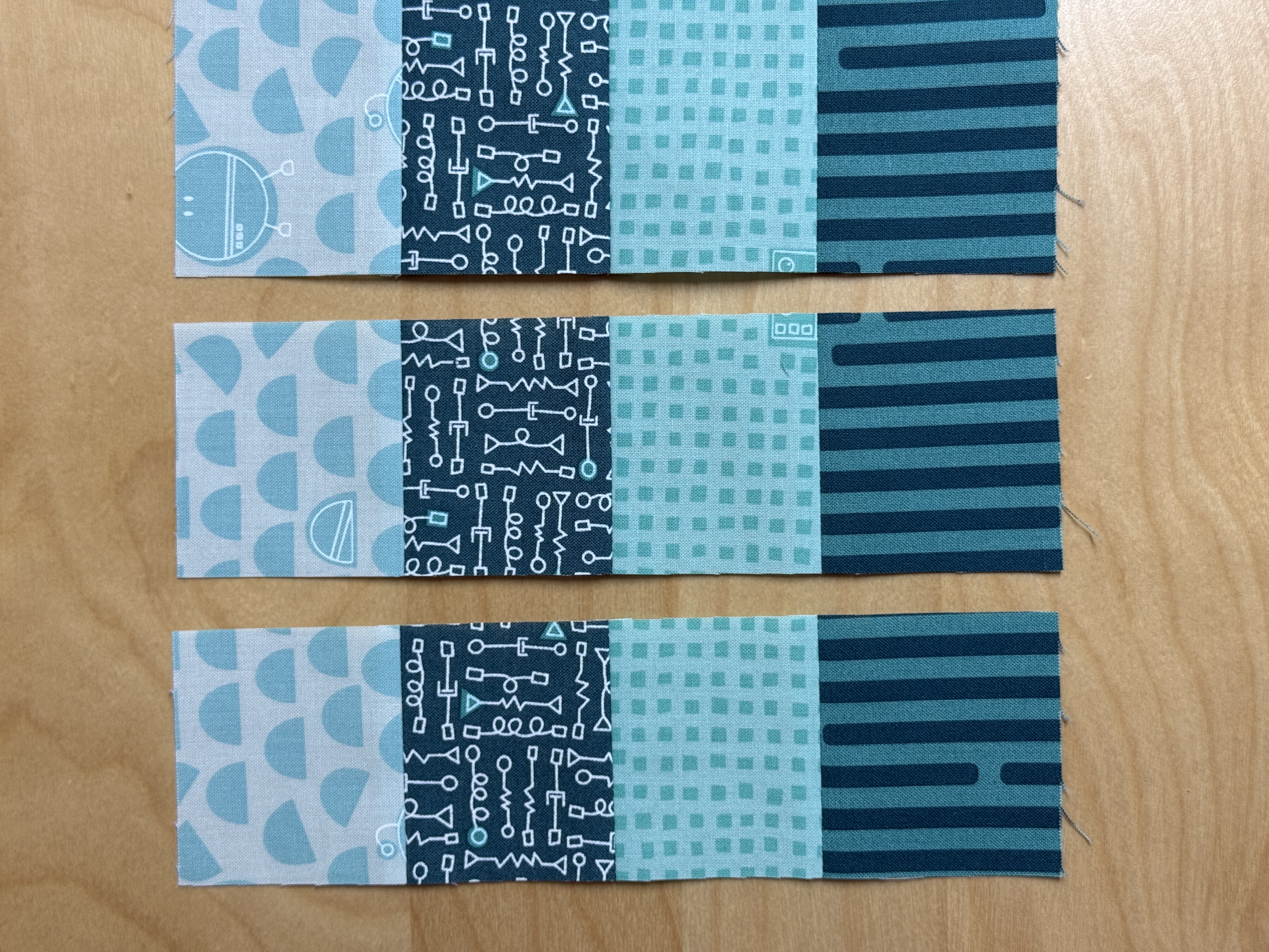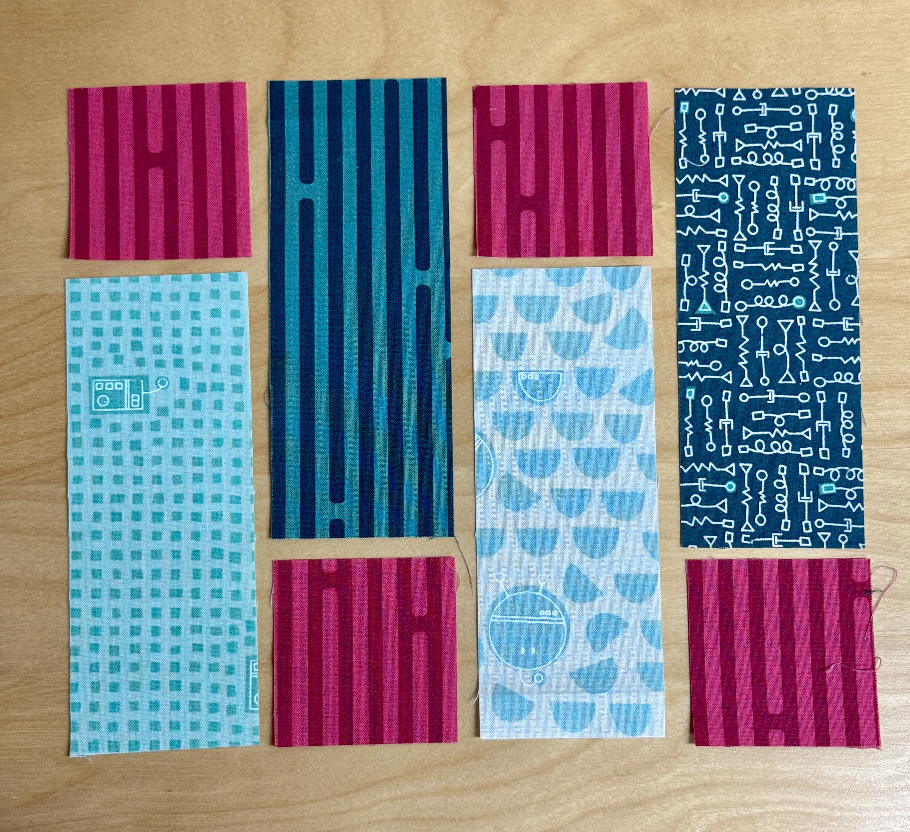 Schneiden Sie 4 Streifen zu je 2,5“ x 8,5“ zu. Nähen Sie diese zusammen und bügeln Sie die Nähte gut auseinander.