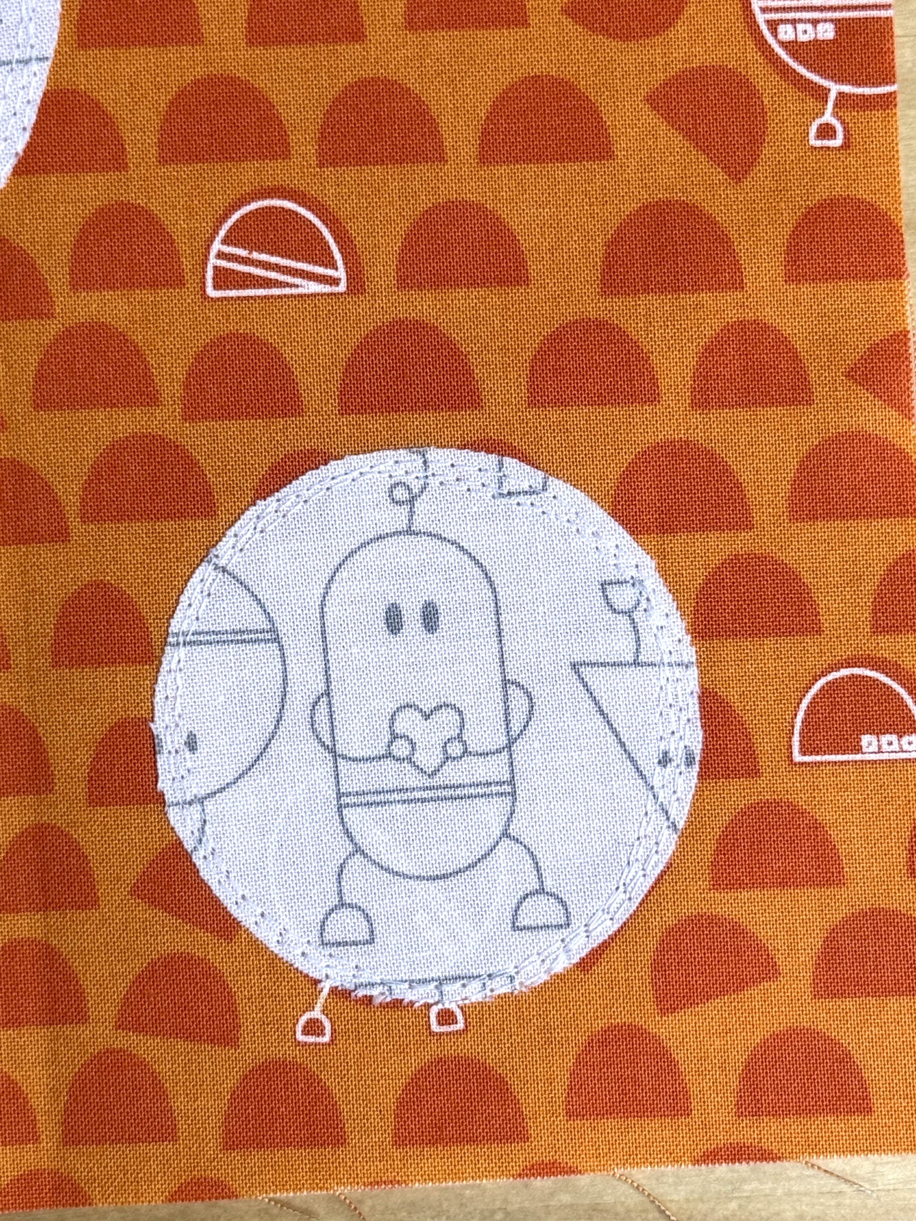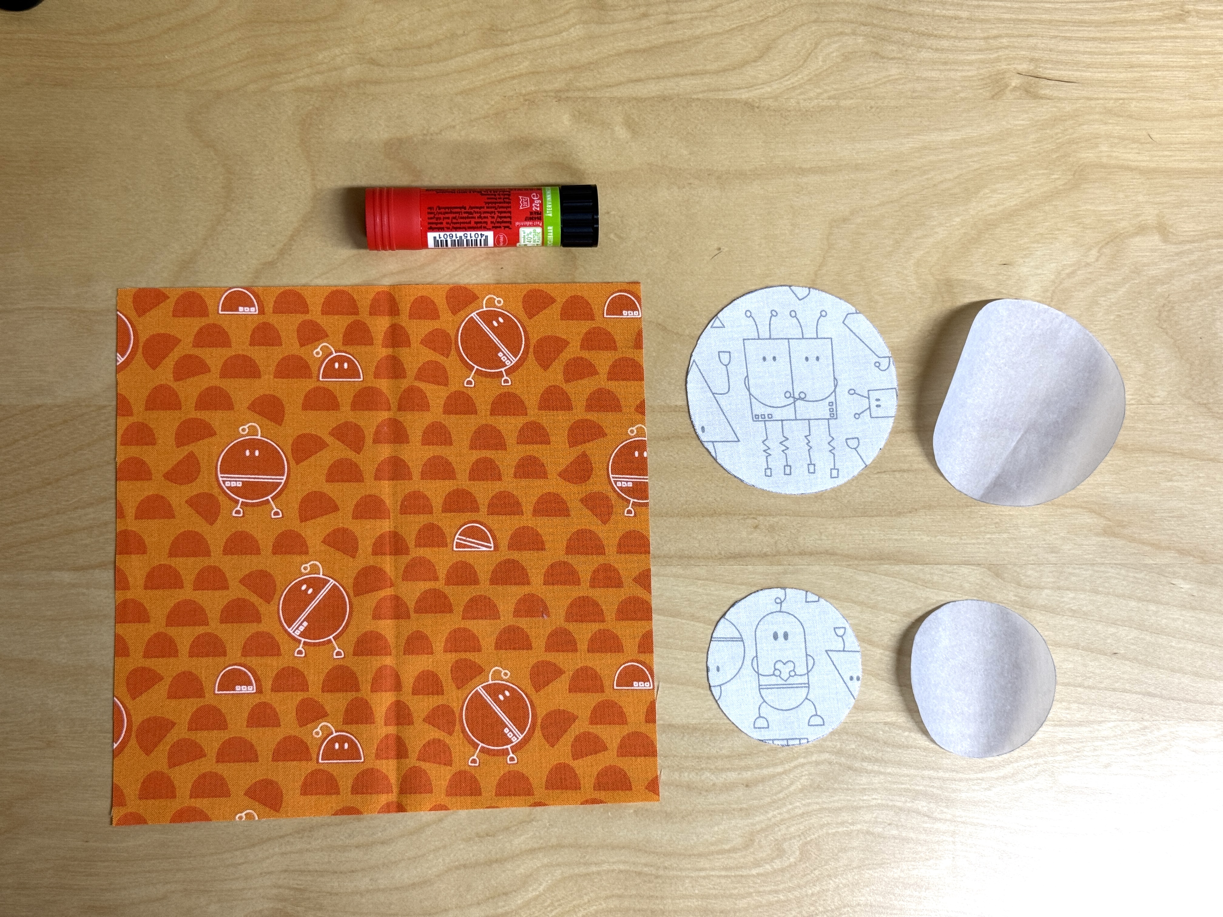 Schneiden Sie ein Quadrat mit 8,5“ und 1 Kreis mit 2,5“ und 1 Kreis mit 3,5“ zu. Bei den Kreisen können sie auch Sachen aus dem Haushalt nehmen. Zusätzlich benötigen Sie die Kreise noch in Vliesofix oder einen Stoffkleber.