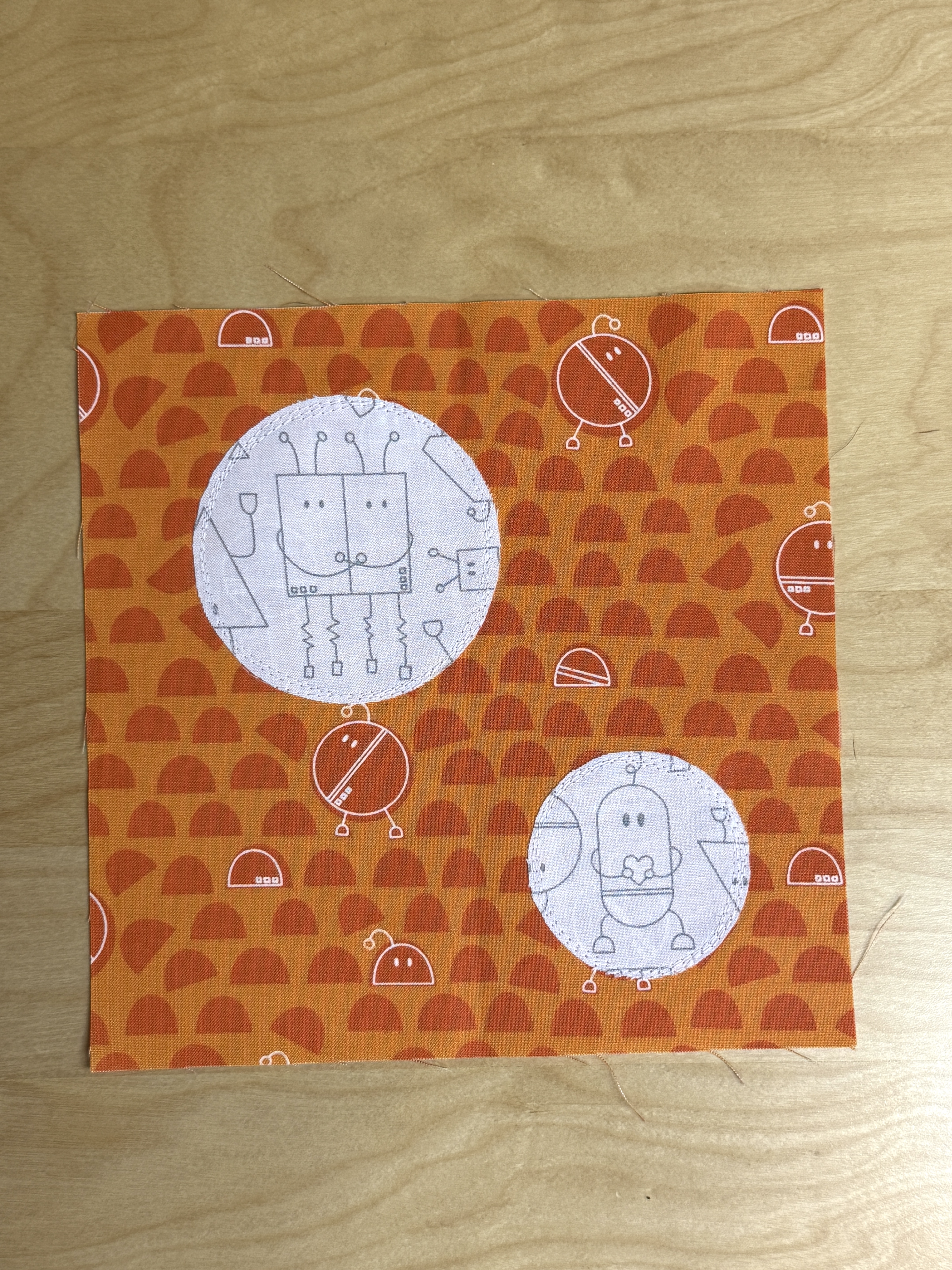Bügeln Sie das Vliesofix auf die Kreise oder bestreichen Sie diese mit Kleber und kleben Sie die Kreise auf ihr Quadrat.