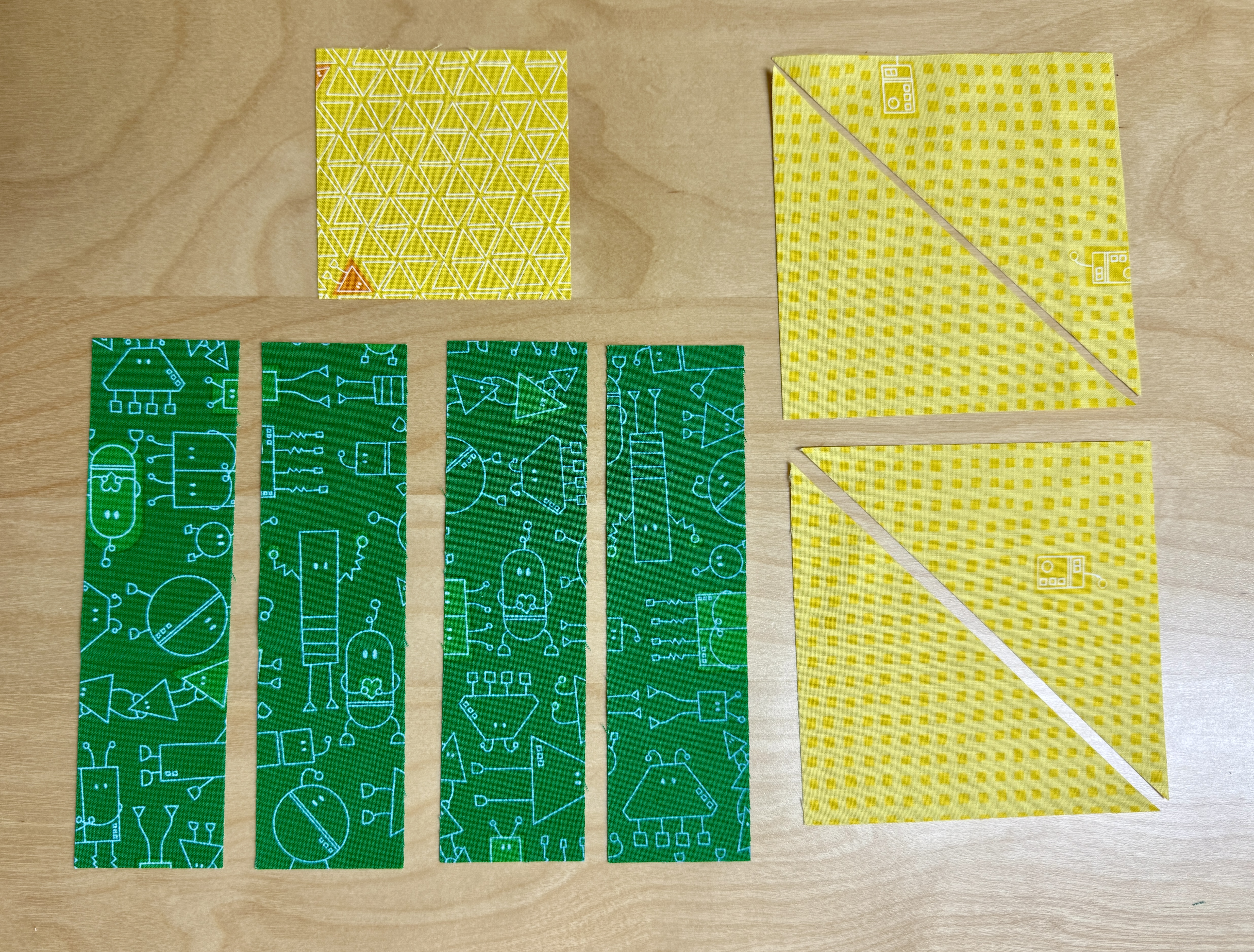 Schneiden Sie: 2 Quadrate zu je 4,5“, 2 Quadrate zu je 2,5“, 4 Streifen zu je 2,5“ x 1,5“, 4 Streifen zu 2,5“ x 4,5“.