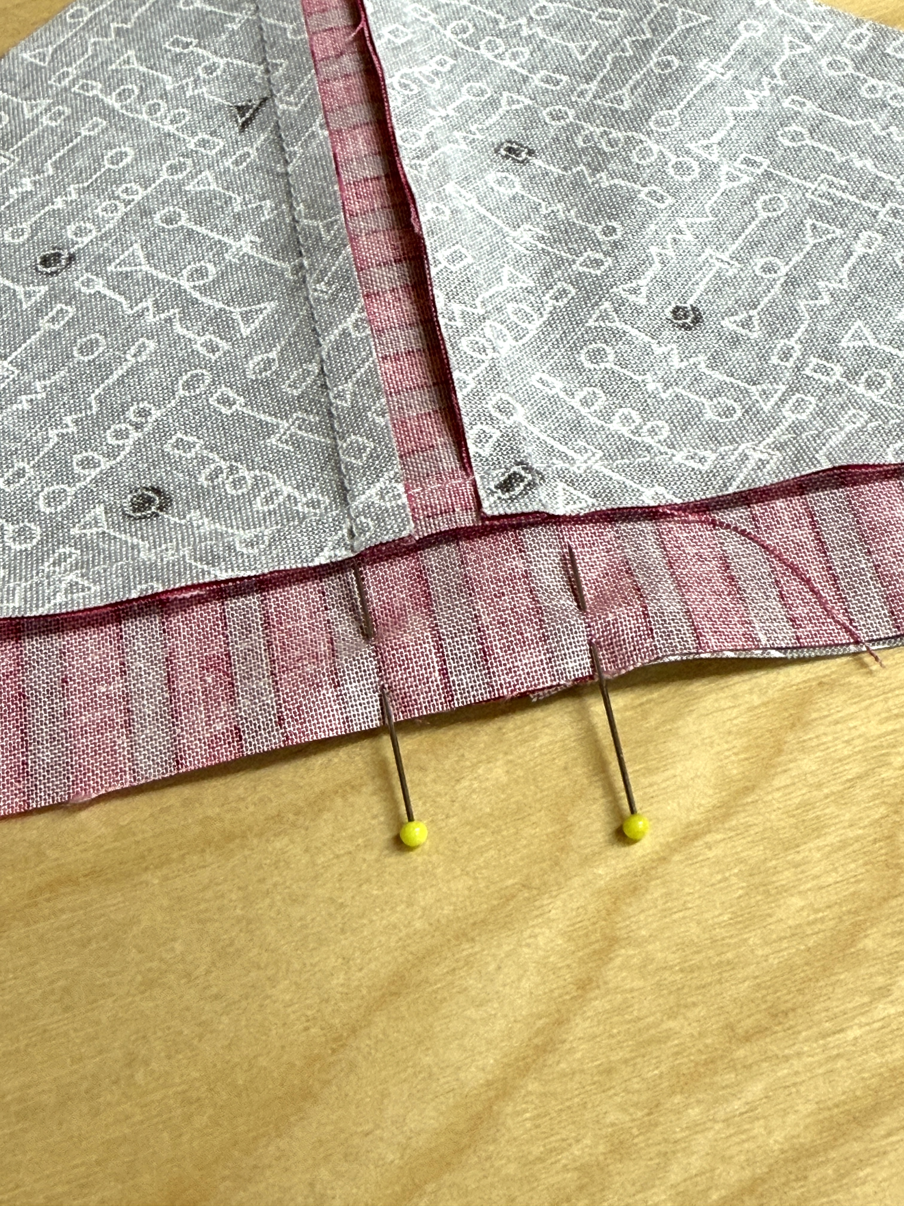 Achten sie darauf, dass die Streifen über den neu eingenähten Streifen auch wieder auf gleicher Höhe sind. Ich habe mir hier ein paar Nadeln zu Hilfe genommen, über die ich drüber nähen konnte, da sie senkrecht zur Naht gesteckt sind.