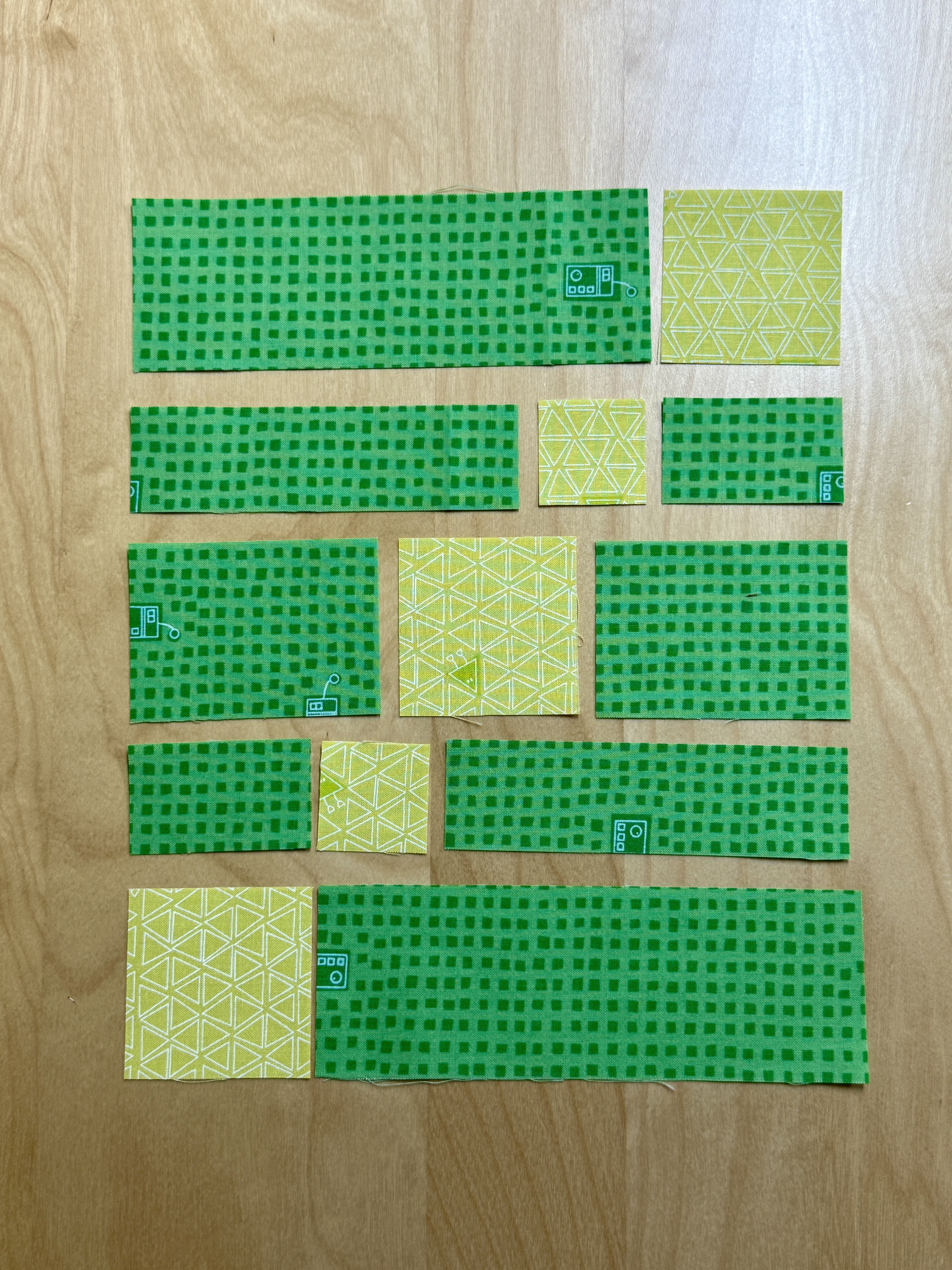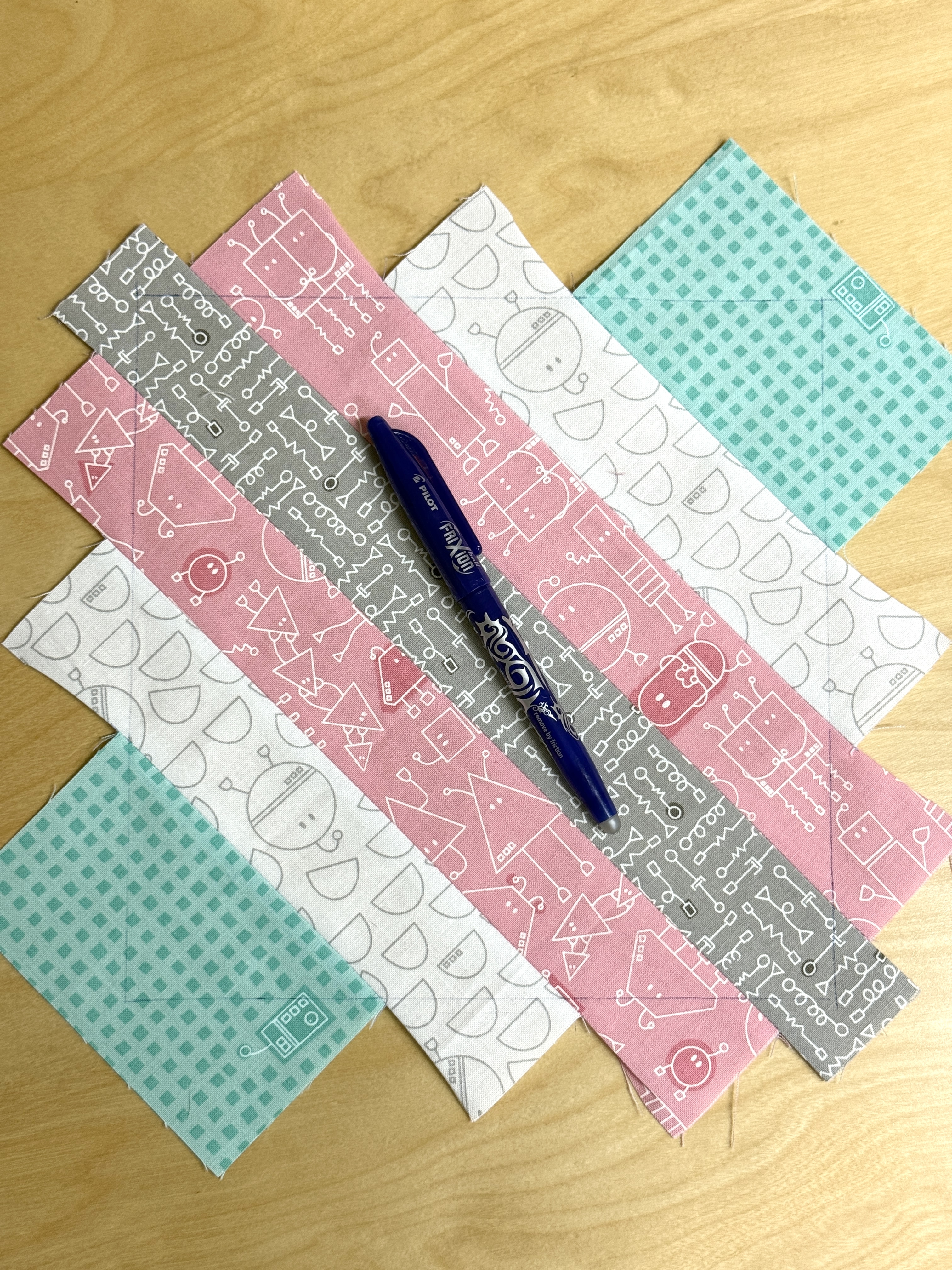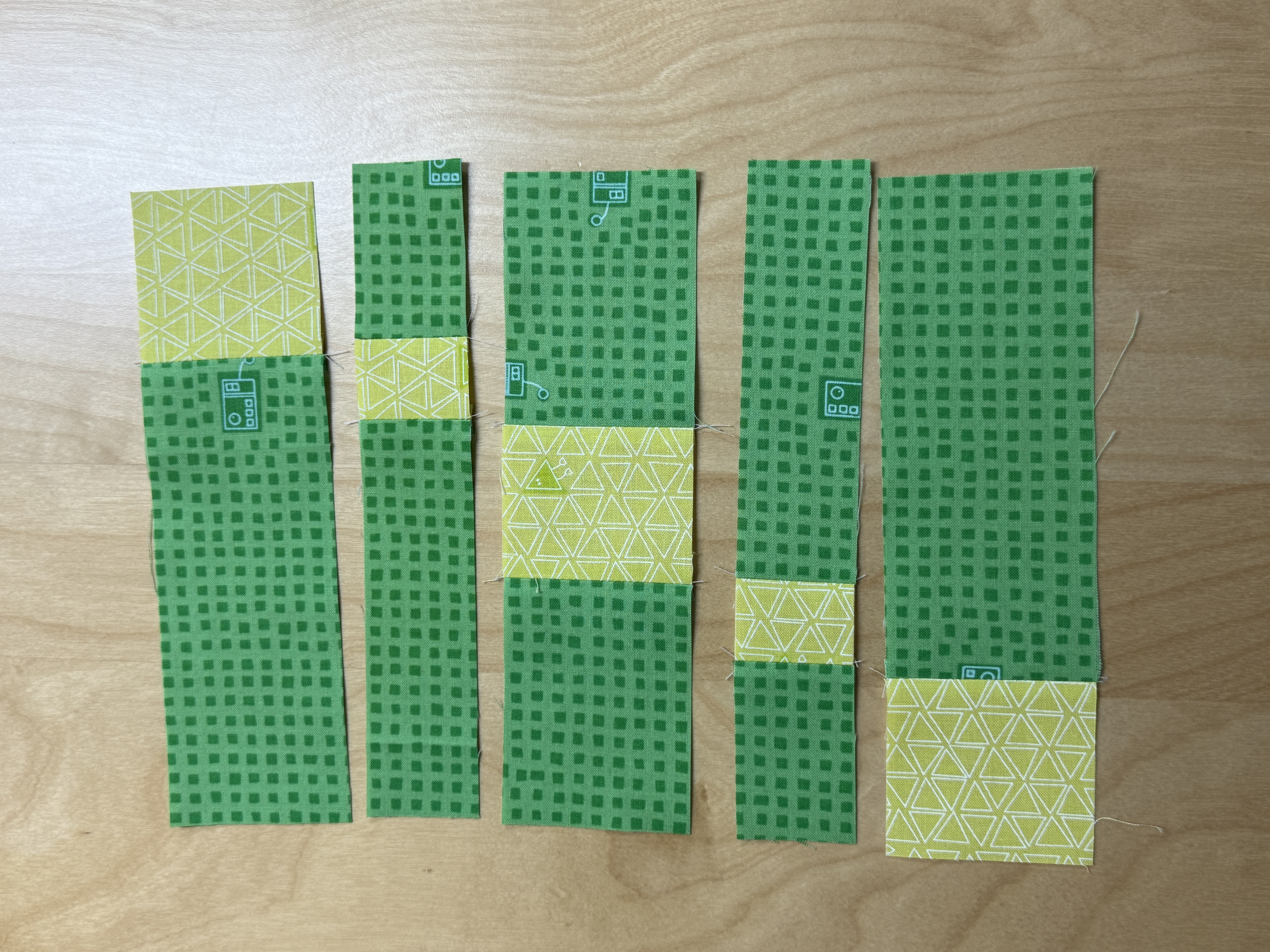 Nähen Sie die Quadrate an die Streifen und bügeln Sie die Nähte gut.