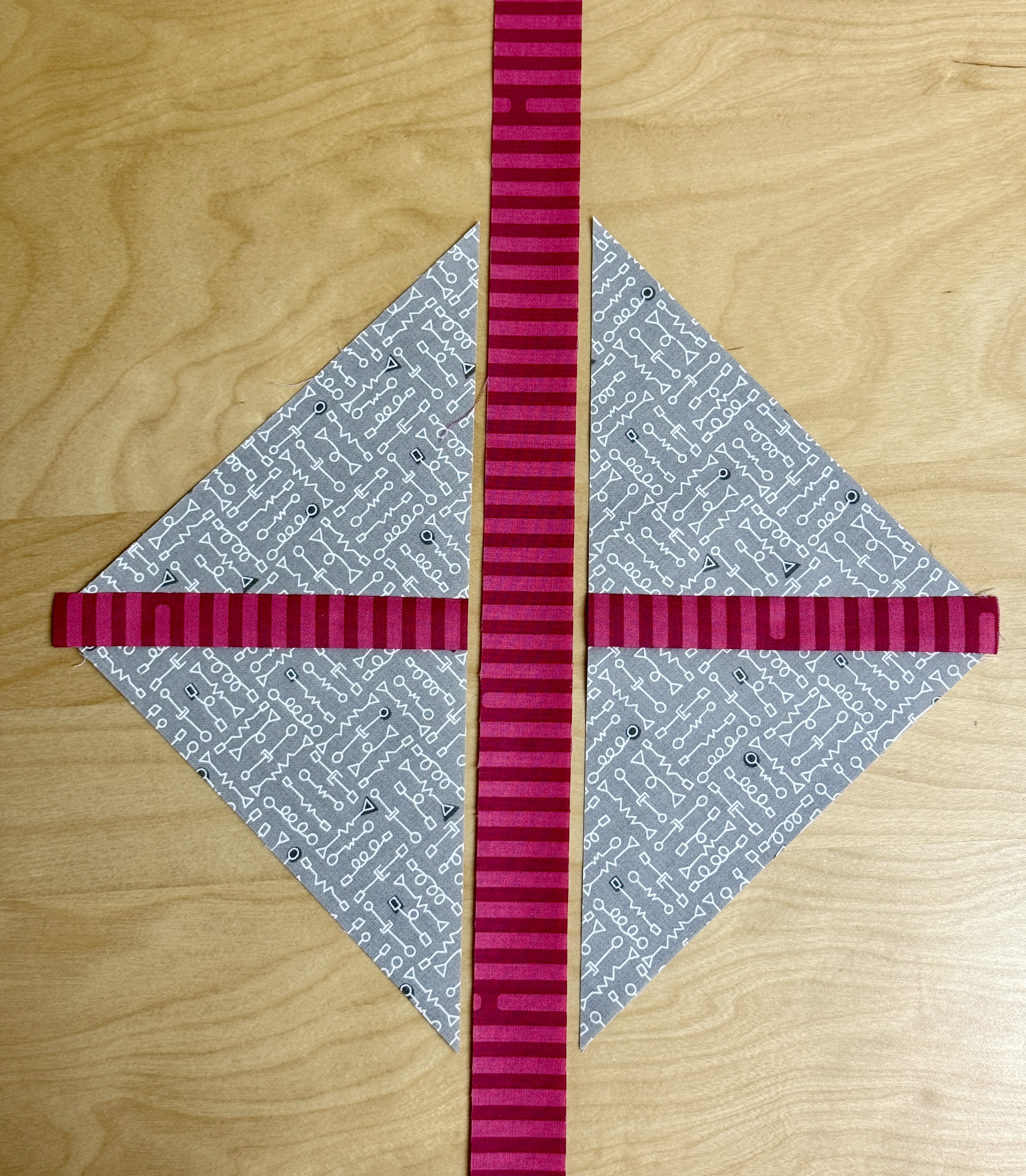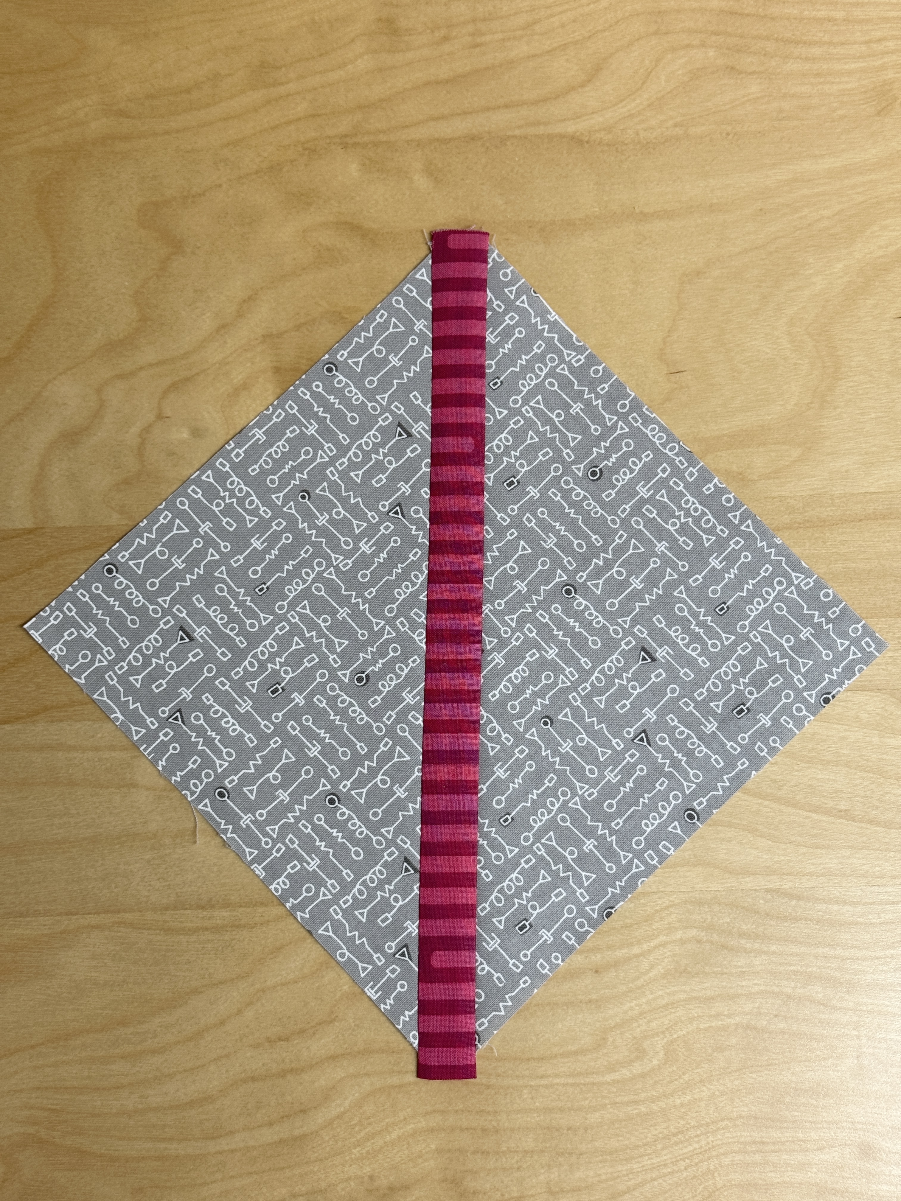 Schneiden sie das Quadrat 1x diagonal durch und nähen sie den Streifen ein. Bügeln sie die Nahtzugaben unter den Streifen.