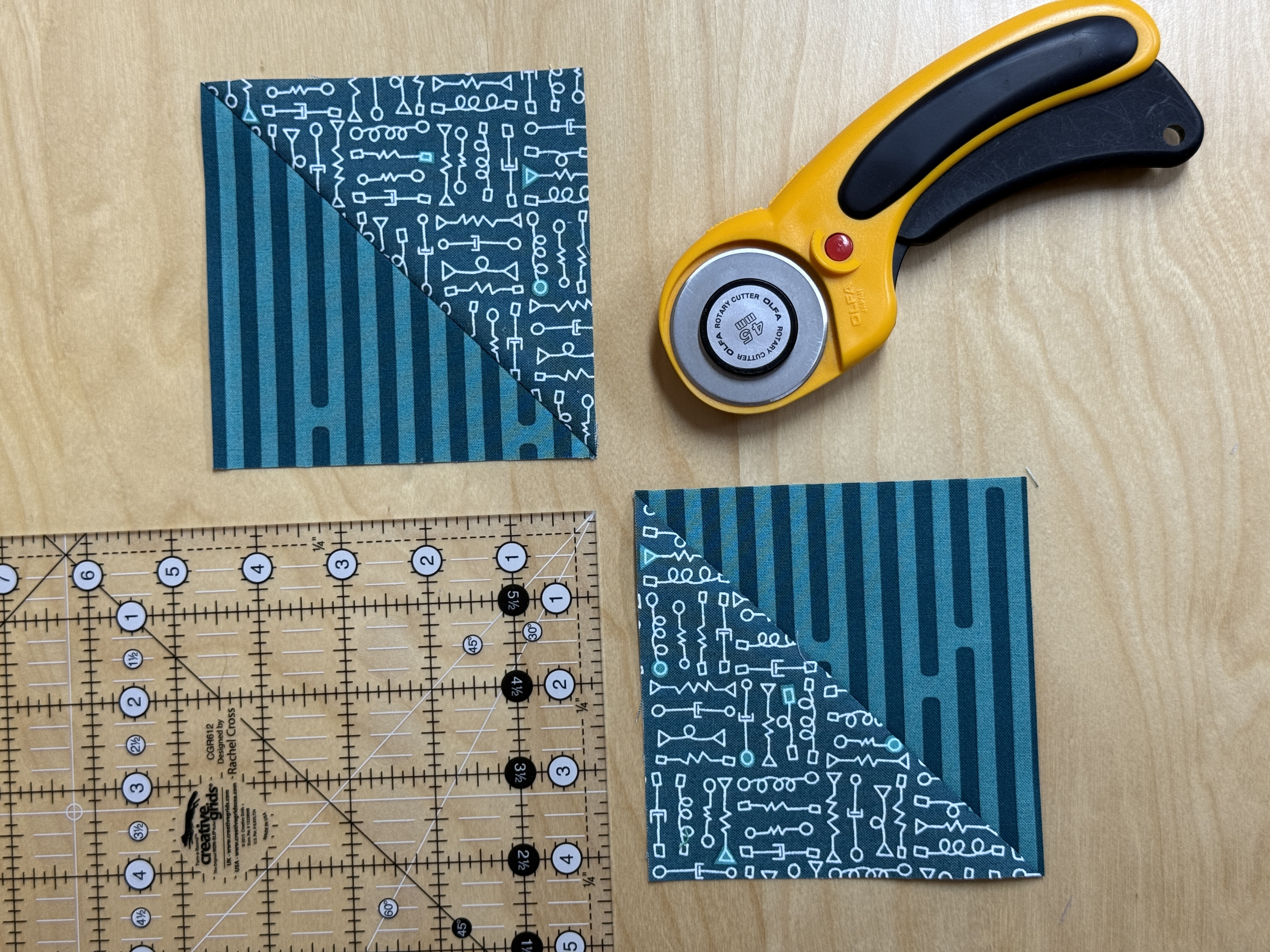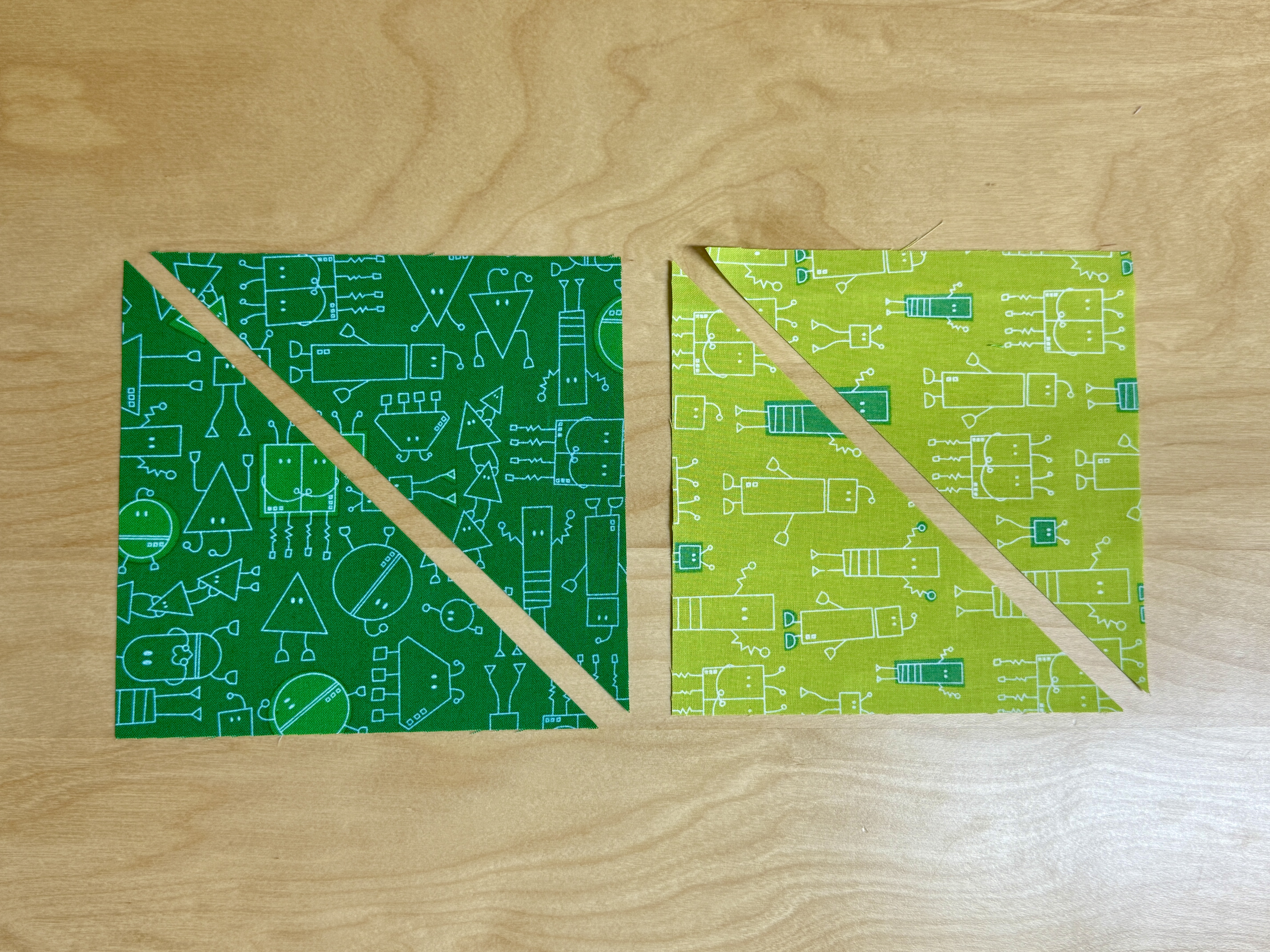 Schneiden Sie 2 Quadrate zu je 6,5 Inch und teilen Sie diese je 1x diagonal.