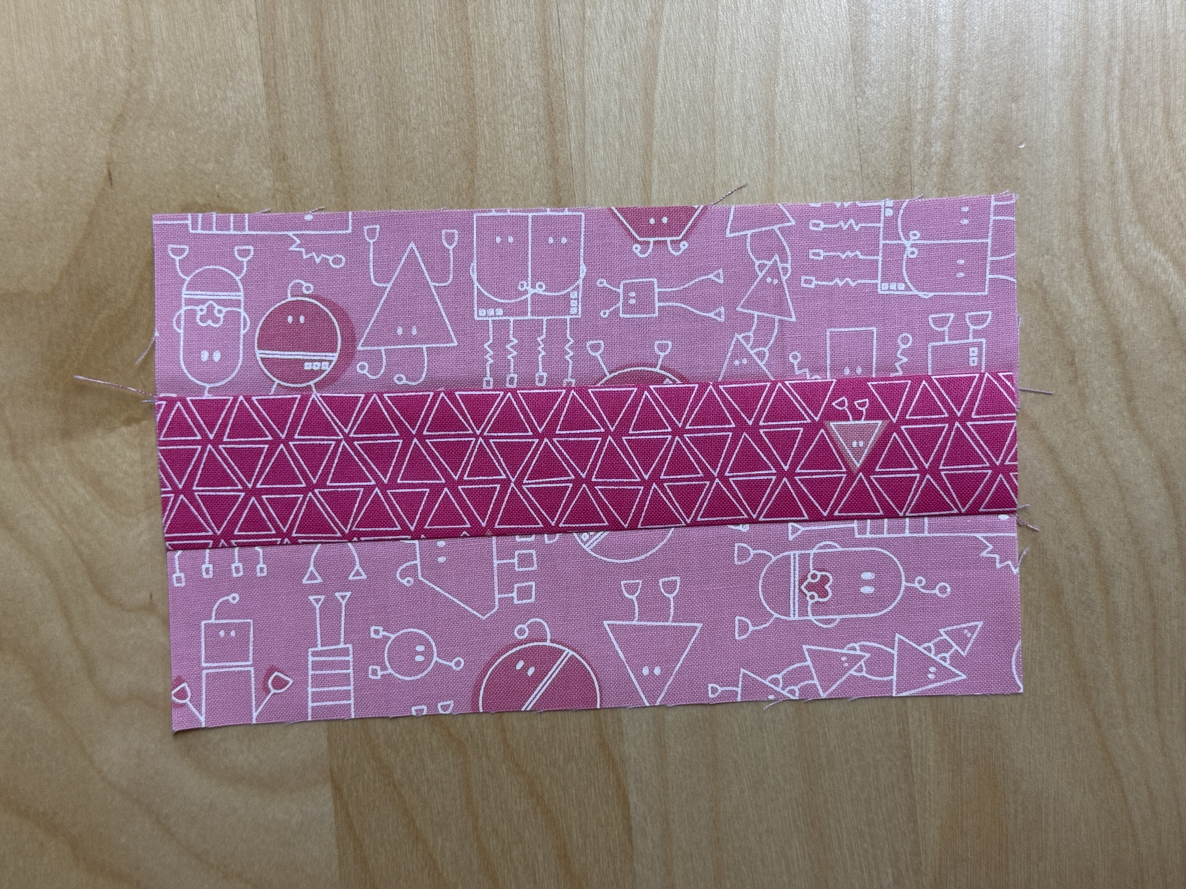 Schneiden Sie die Teile auf 8,5“ x 4,5“ zurück und nähen Sie diese zusammen. Bügeln Sie alles gut.