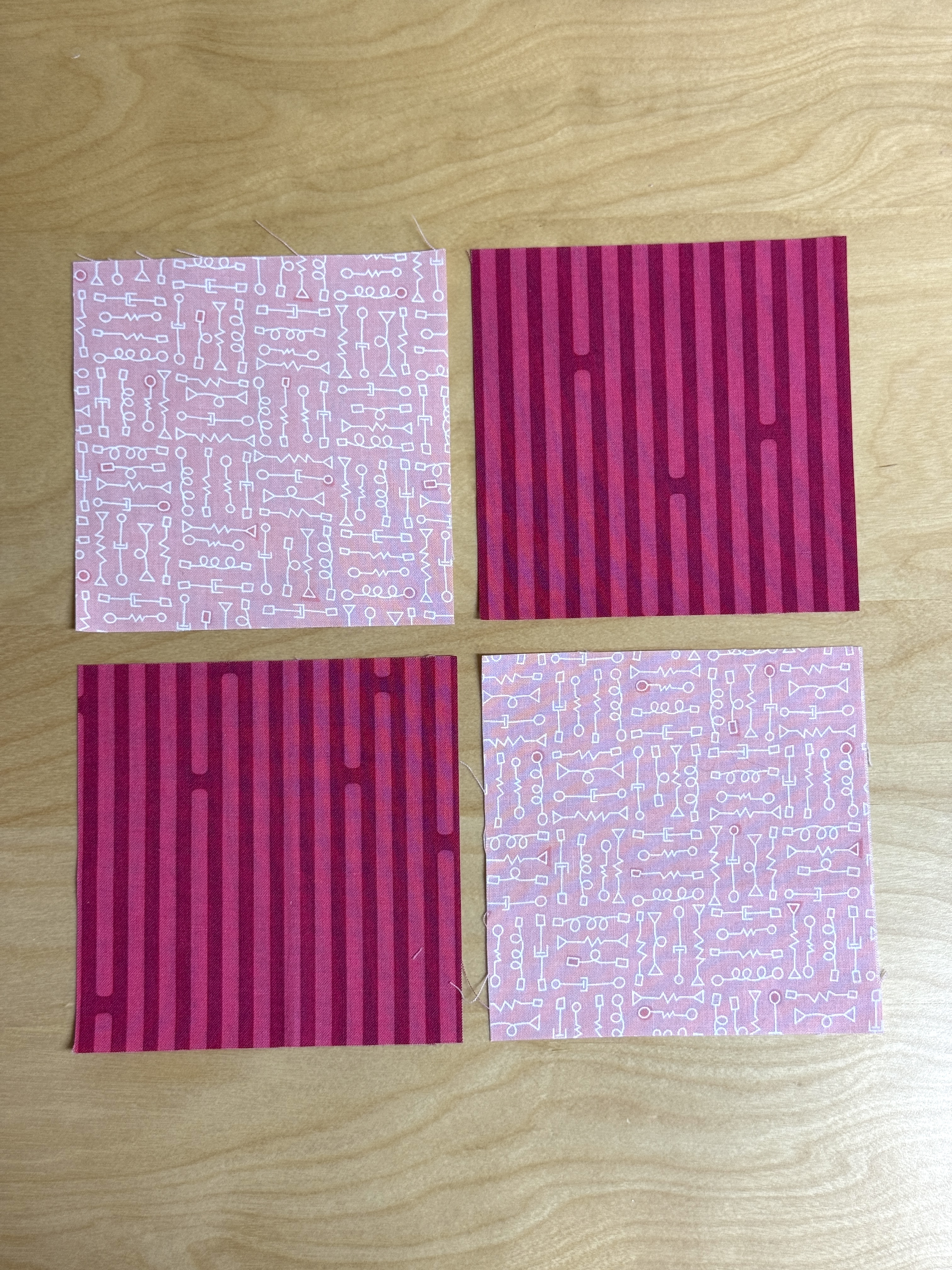Schneiden Sie 4 Quadrate mit je 5" zu (Nahtzugabe ist bereits enthalten) und nähen sie diese zusammen wie oben abgebildet.